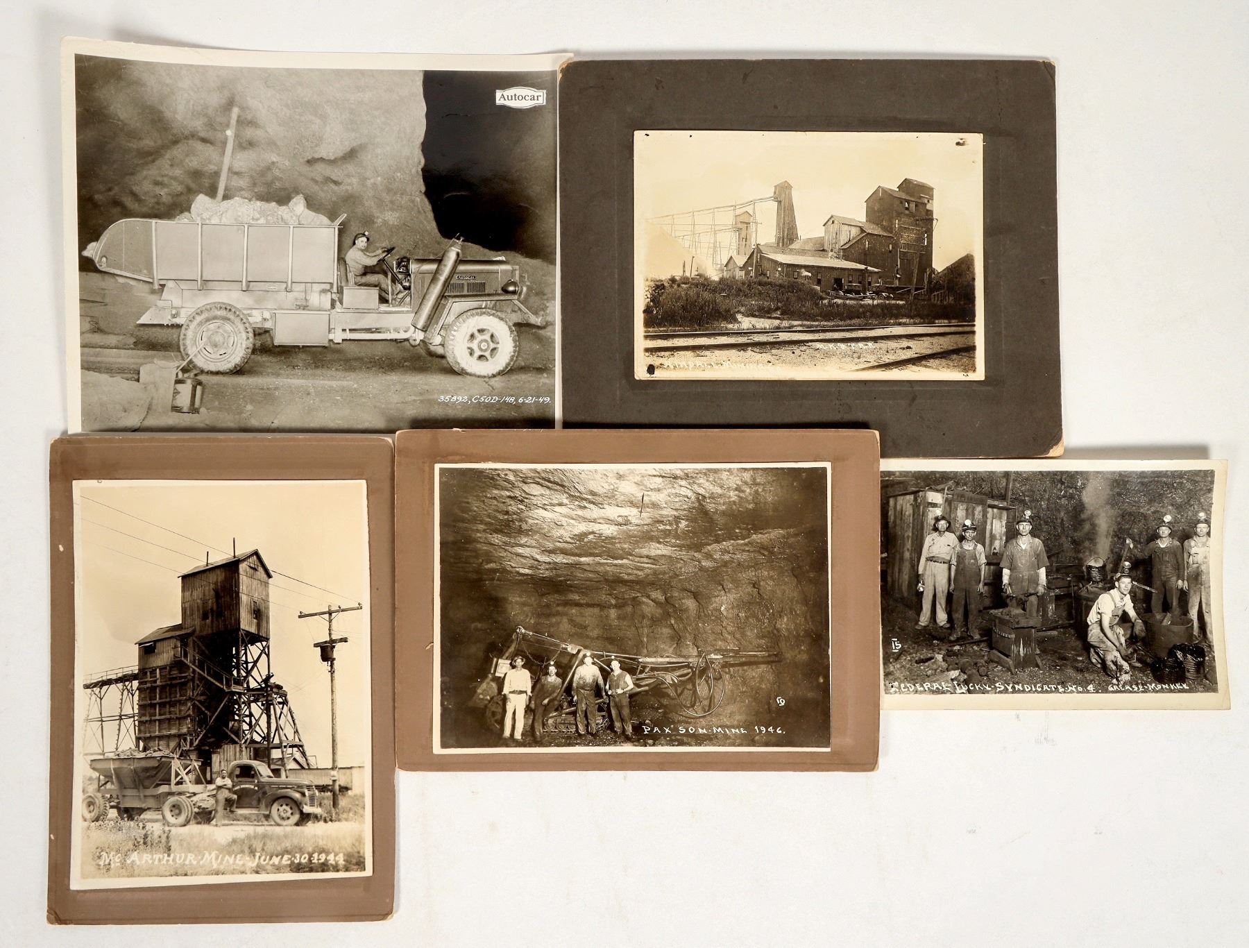 Lot of 5 different. The second World War created an unprecedented demand for lead and zinc, crucial for the production of ammunition (bullets, shell casings), galvanizing, and other essential war materials. All photos but one are 5 x 7" 1) Underground view of 4 miners next to drill. Labelled Paxson Mine 1946. 2) Surface exterior view of man in front of truck loaded with rock. Labelled McArthur Mine, June 30 1944. 3) Underground view of six miners, one next to buckets of grease. Labelled Federal Lucky Syndicate No. 4 Grease Monkey. 4) Exterior view of mine/mill with railroad tracks in front for the MK&T RR. Labelled Aimpale Mining Co. 5) 8 x 10" 1949 press photo of Autocar loaded with rock, Eagle Picher Mining & Smelting Co.
