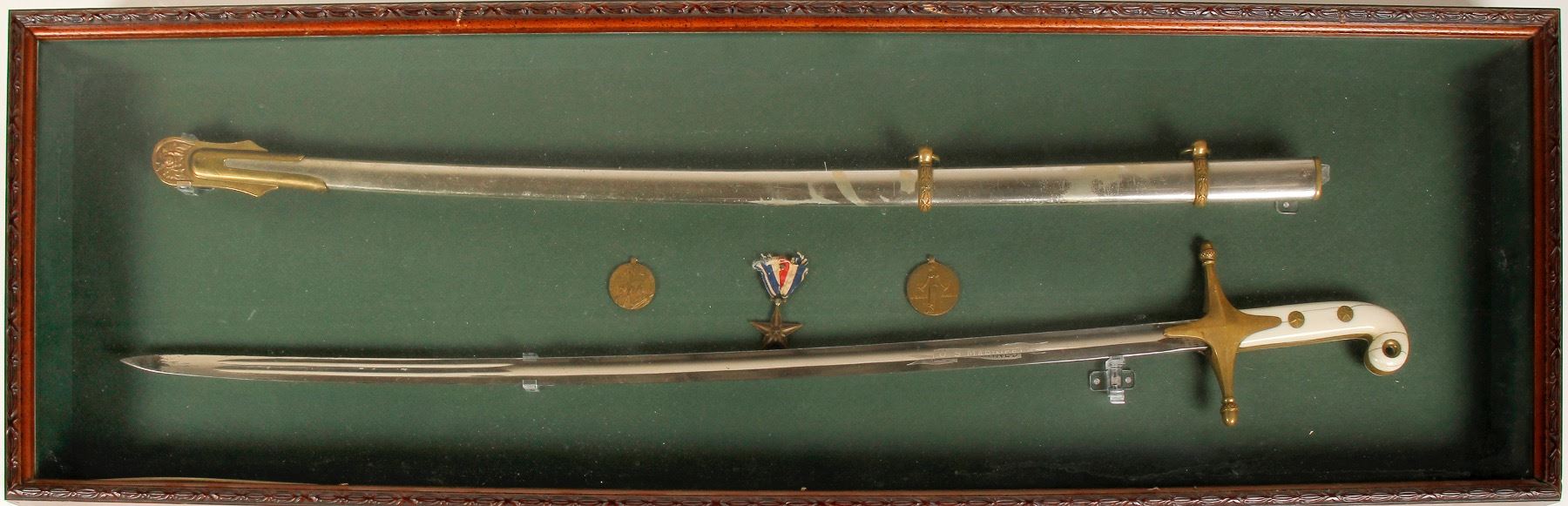 Sword with scabbard. Scroll work 'U. S. Marines.' Under gold gilt handle it says 'F J /HEi8E---RGER / Washington.' (Entire information can not be read as the sword is encased.) Sword measures 36". Case is 13.5 x 41.4 3". Date: c1944 Location: HWAC# 58244