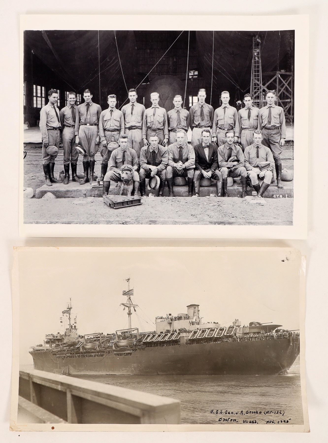 Three photographs of World War II military subjects. Two photographs feature the U.S.S. General J.R. Brooke, a Navy transport vessel, in the harbors outside Boston and New York City, both taken in 1945. One photograph depicts a group of seventeen U.S. Navy men posing with their dog. The reverse side of the photograph has a lower-quality reproduction of the same image labeled with the men's names.[