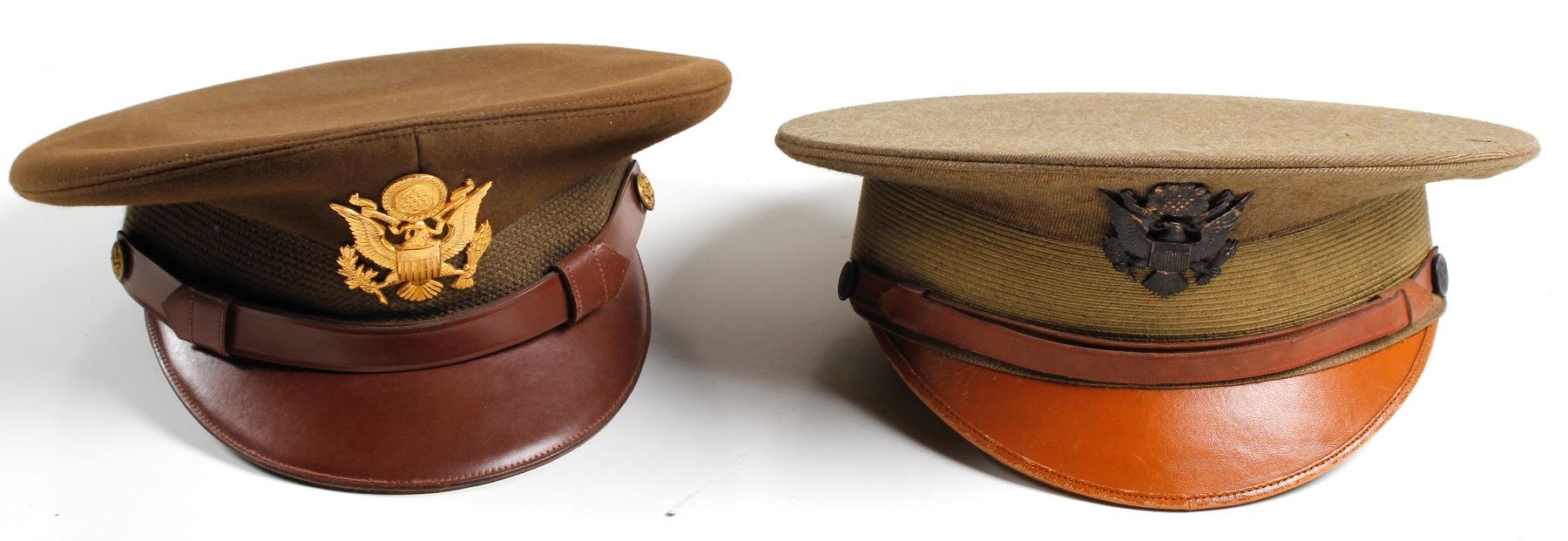 Two. World War II Army officer hats. An brown officer's hat worn by an American officer of the United States Army Air Forces USAAF during World War II. Made by Oxford Tailoring, Seattle. The second one WWII US Army Officer Dress Hat - called 'Major', made Marshall Fields Compan, Chicago. Brass emblem on front classic khaki brown. Both in excellent condition. Hamilton Hat Collection. Date: Location: HWAC# 64469