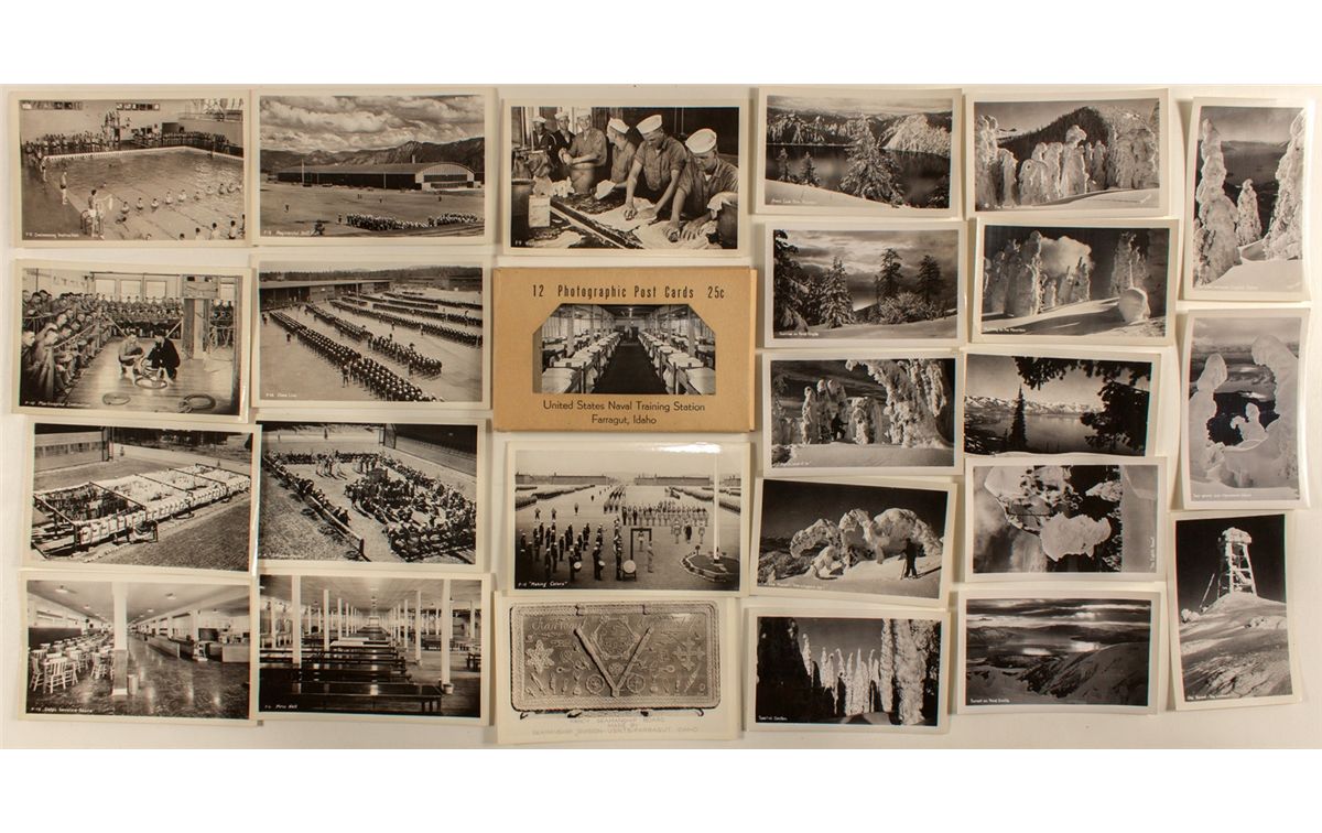 Lot of 25. A set of 12 real photo postcards of the United State Naval Training Station and 13 (2.5 x 4.5") black and white photographs of winter scenes at Farragut by Ross Hall.