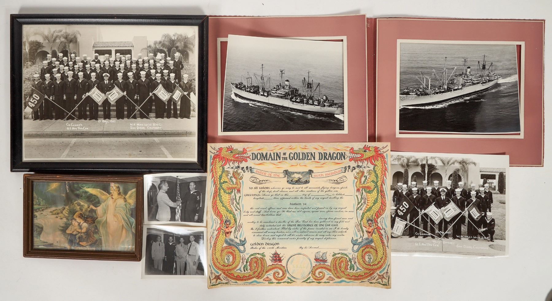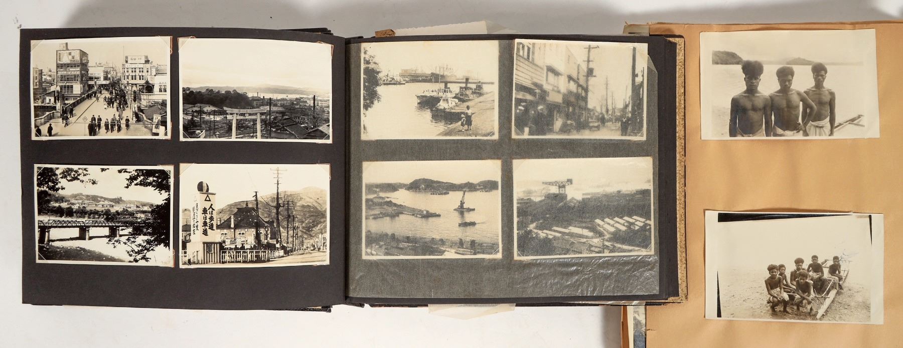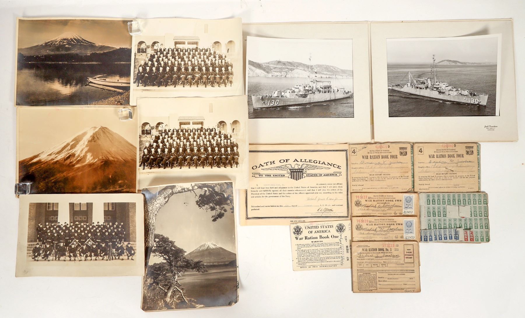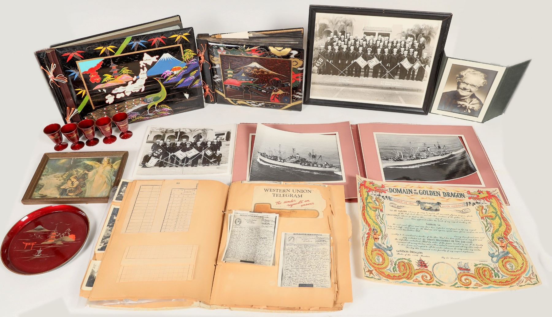 One sailor's World War Two archive. A scrapbook of photographs; a Japanese photo album; a tea tray with four demitasse cups; an empty Japanese photo album; 8 x 10 glossies of officers, The Domain of the Golden Dragon; 1951 U.S. Navy Training Center San Diego photo; War Ration coupon books; U. S. Navy pennant; servicemen's guide books. Interesting historical collection.