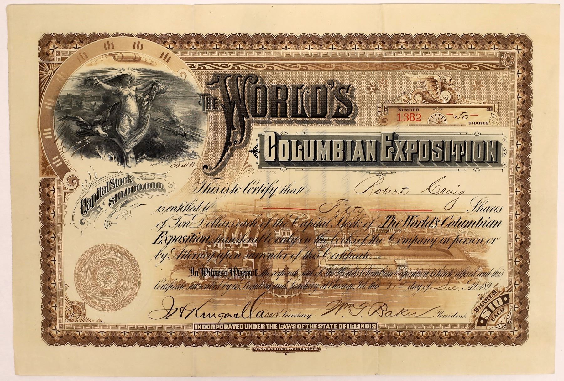 Inc. in Illinois. No. 1382, issued for 50 shares to Robert Craig in 1891. Signed by president William Baker and asst. secretary JH Kingavill. Not cancelled. Brown border and background, black print, and large allegorical vignette at upper left. Underprint vignette with a birds-eye view of the Exposition. Printed by Western Bank Note Co., Chicago. 8.25 x 12" Deep folds. The World's Columbian Exposition was a world's fair held in Chicago in 1893 to celebrate the 400th anniversary of Christopher Columbus' arrival in the New World in 1492. The expo. was open May 1st-October 30th, 1893.