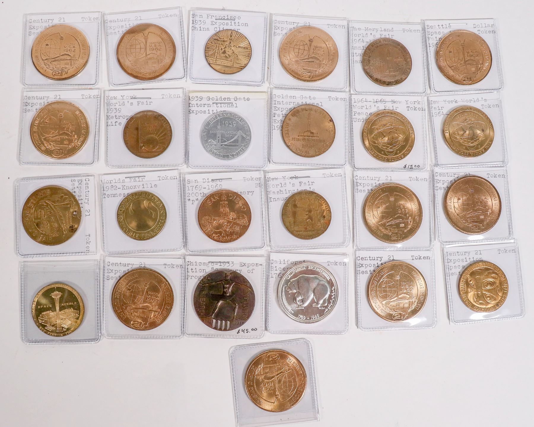 Lot of 25 medals, mostly World's Fairs. 1939 Golden Gate International Exposition (three different). 1933 Chicago "Century of Progress"; 1964 New York World's Fair (4); 1939 New York World's Fair; 1982 Knoxville World's Fair; 1962 Seattle Century 21 Exposition (13); 1969 San Diego 200th Anniversary; 1969 California Bicentennial.