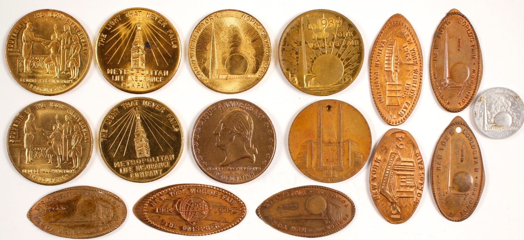 Lot of 16 pieces from the 1939-40 New York World's Fair. Seven Elongated cents; nine tokens. Daniel Manassillian Collection.