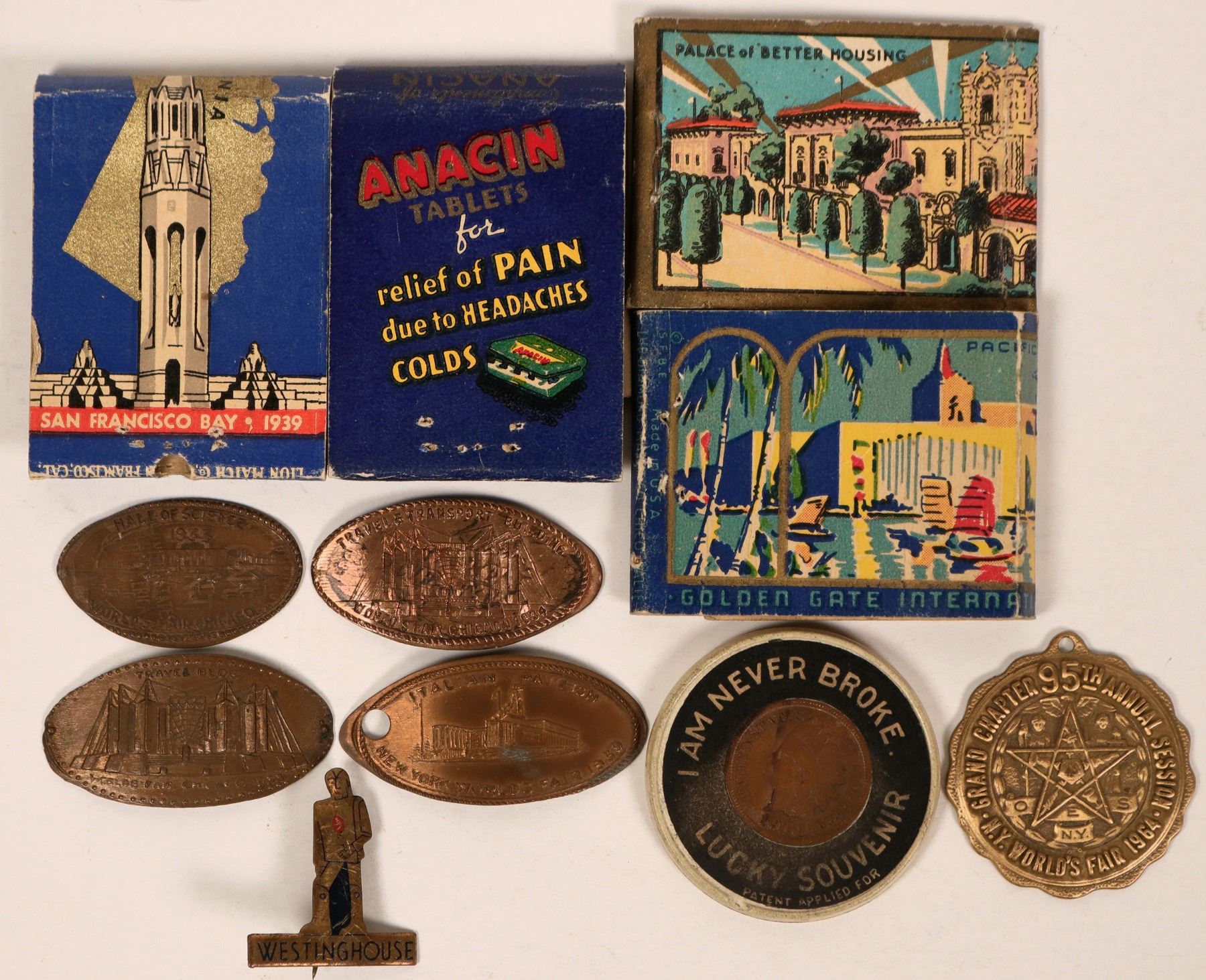 Group of eleven World's Fair collectibles: 3 GGIE matchbooks , 1 CPIE matchbook; 3 1933-34 Century of Progress elongated cents; Pan Am Buffalo, NY expo 1901 encased cent in unusual holder; 1939 NY pinback; 1964 NY medal; 1934 WF elongated cent.