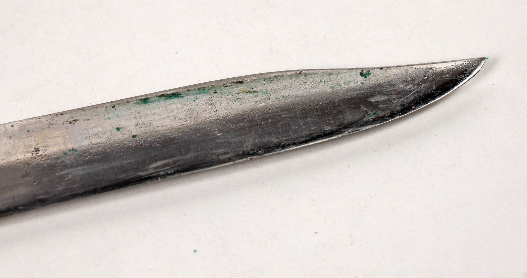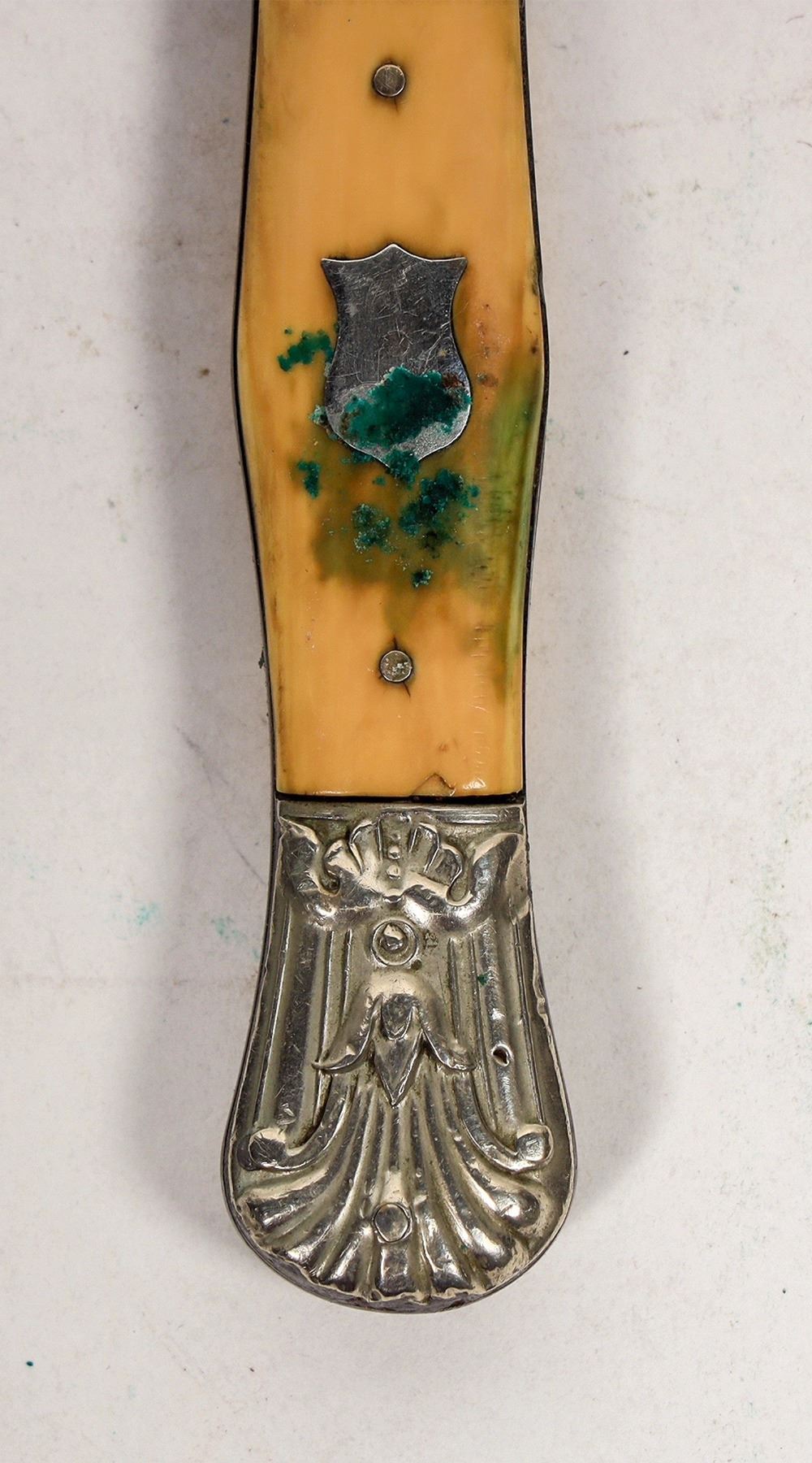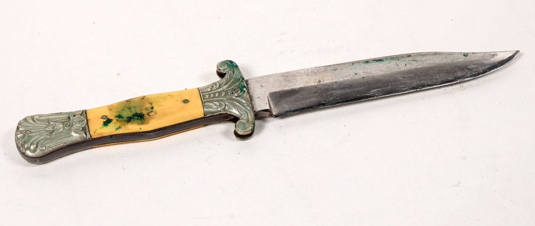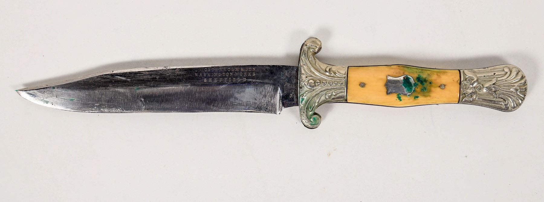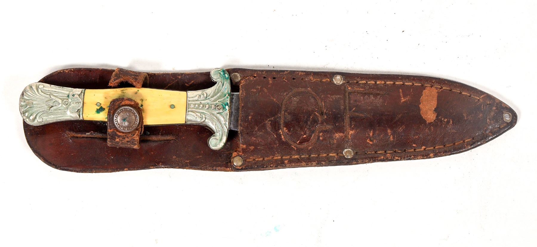 This is a George Wostenholm & Son bowie Knife. It is marked "I*XL" on the ricossa and "G. Wostenholm & Son/ Washington Works/ Sheffield" indicating a 1848-1870's manufacture. It is 9 in. overall length with a 5 in. blade. The scales have an ornate scrolling guard and cap; the scales are a type of bone. A shield is present on the left side scale. Some light loss of material on the right scale. Some veritas from a life in the sheath. Overall good condition with original sheath. The Snap closure on the sheath is present but broken. This knife may have been imported into the USA in time for the Civil War. "GF" is carved into the leather. Please see photo for details. (ref. oldpocketknives.com/george-wostensholm-ixl.knives)