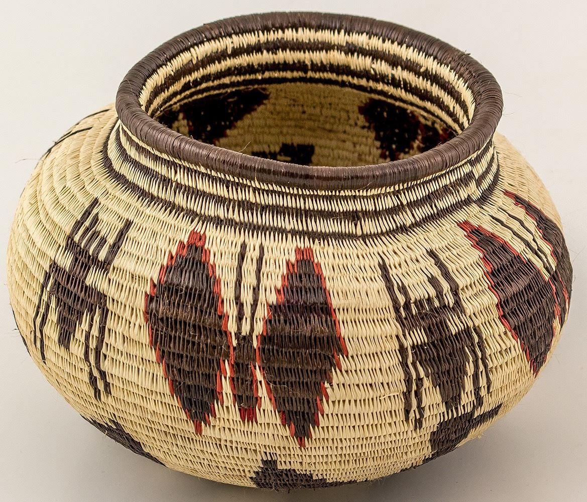 Beautiful design of butterflies, insects and birds. 7" diam x 5.5" deep. The Wounaan Indians of the Darien Rainforest in Panama, are believed, to be the finest weavers in the world. Using the Chunga palm and other plant materials, they make utilitarian baskets, ceremonial pieces, masks, and the most beautiful and intricate basketry depicting plants and animals, fish and flowers, insects and geometric patterns. HWAC# 32163