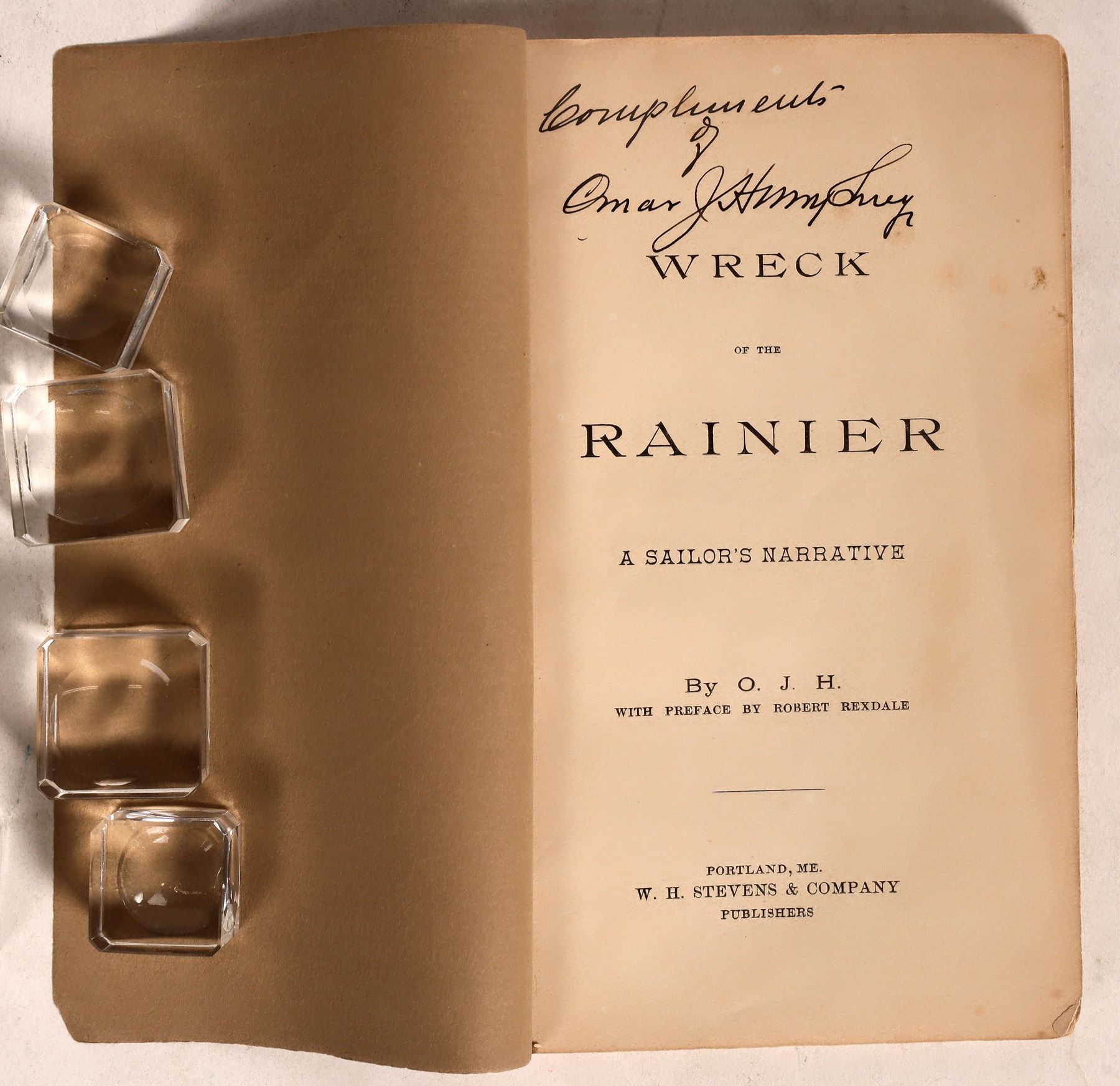 Rare 1887 Wreck of the Rainer by O. J. H. (Omar J Humphrey) with inscription. Japan, Golden Gate, various voyages, savages, Rainer wreck etc. Soft cover 148pp. Rebound spine, upper right tape inside back cover. Please inspect.