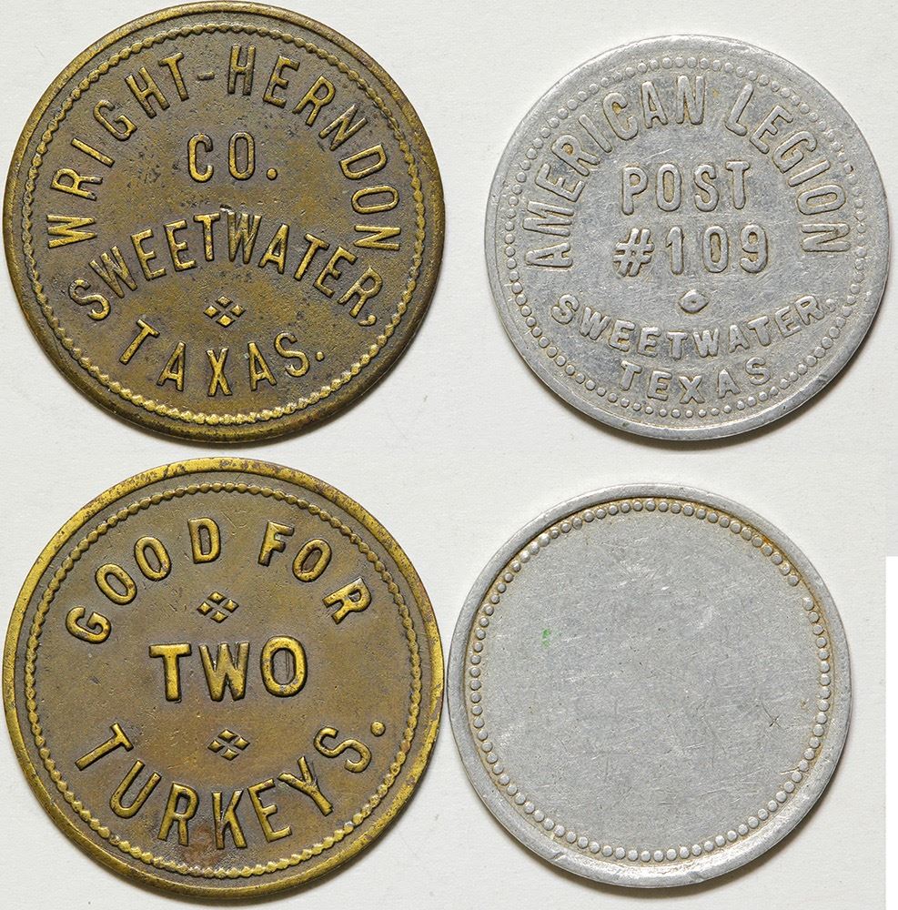 Two tokens, Texas misspelled TAXAS on Wright-Herndon piece. Legion piece is Post 109 HWAC# 62708 Date: Location: Sweetwater, Texas