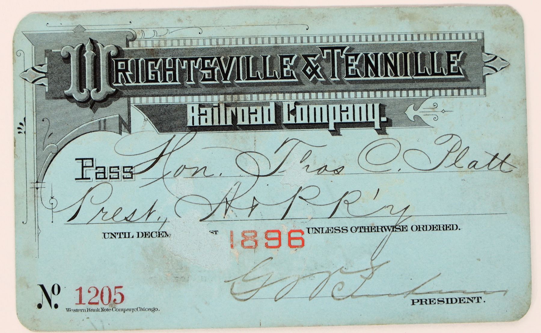 1896 Wrightsville & Tennille Railroad Co. pass, hand signed by G F Ilegible president. Some paper loss on front to the left of 1896, foxing on both sides. Please inspect.