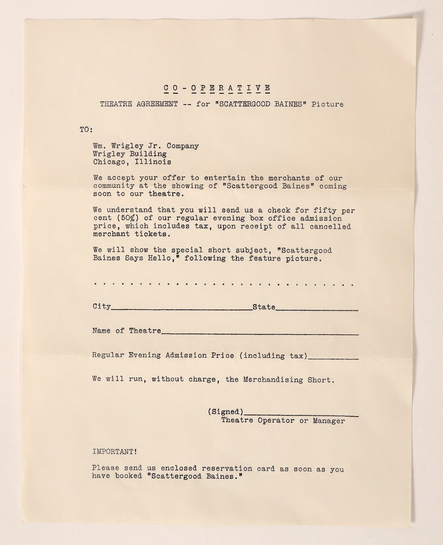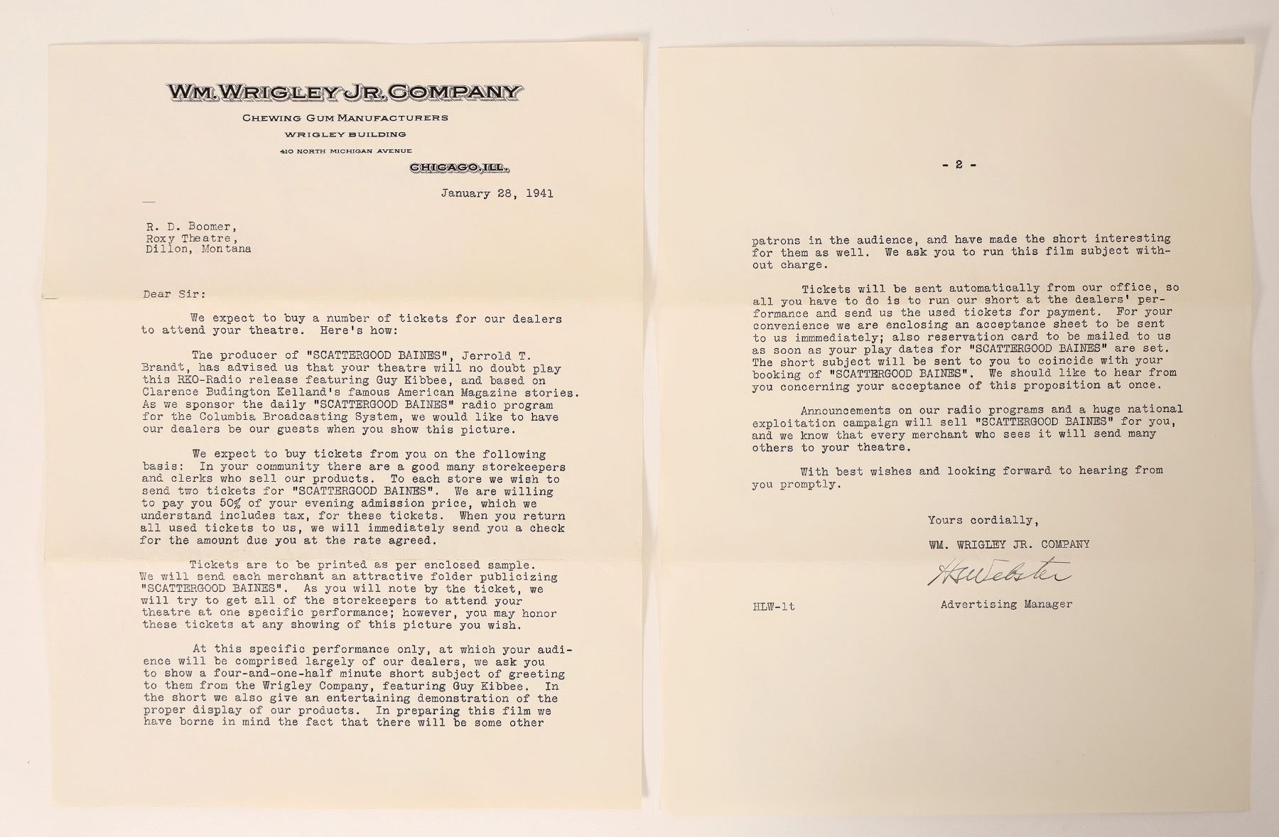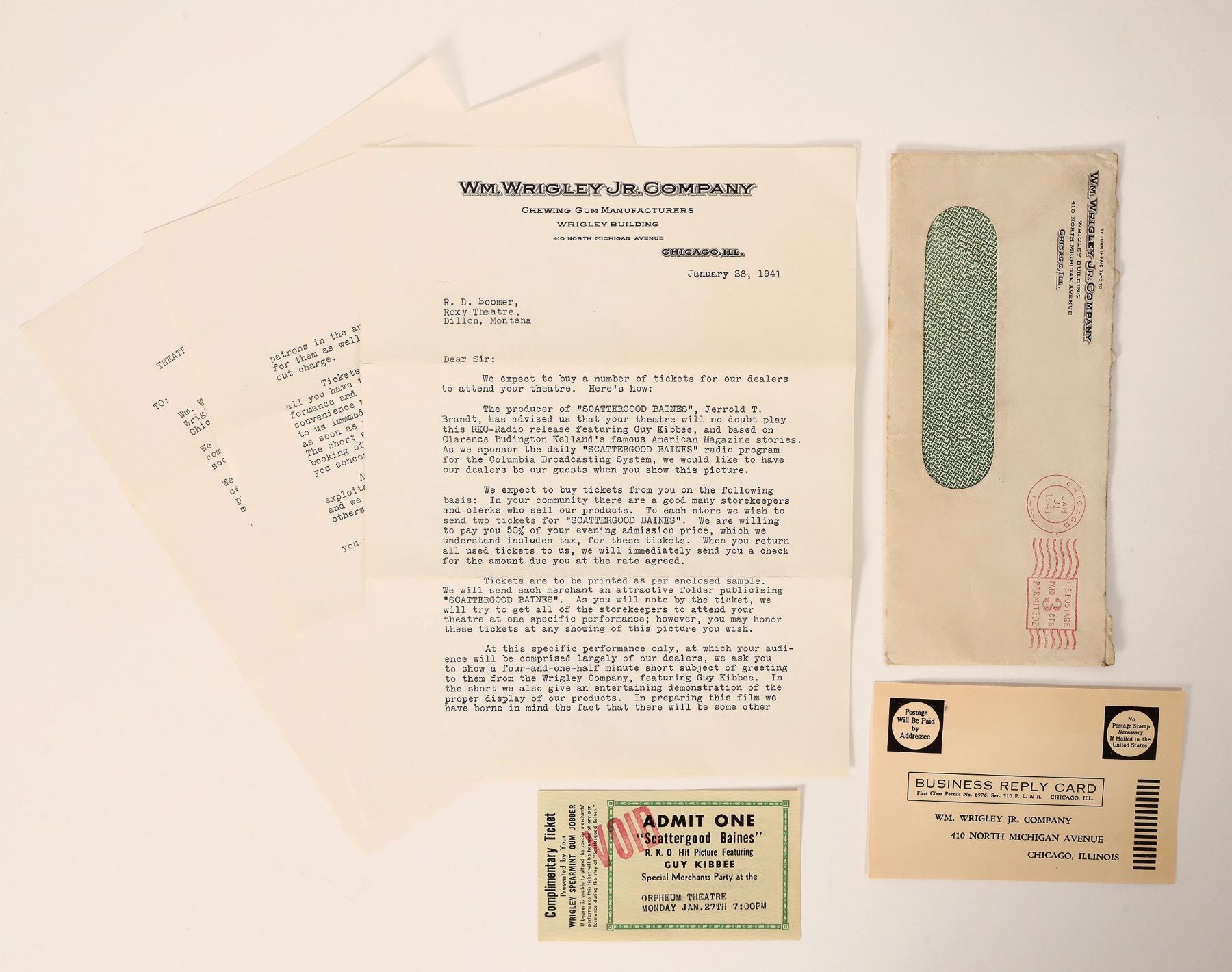 1941 Wm. Wrigley Jr. Company letter head related to tickets for a performance of Scattergood Baines along with a cover, sample ticket and contract.[