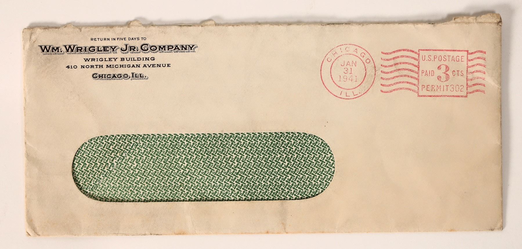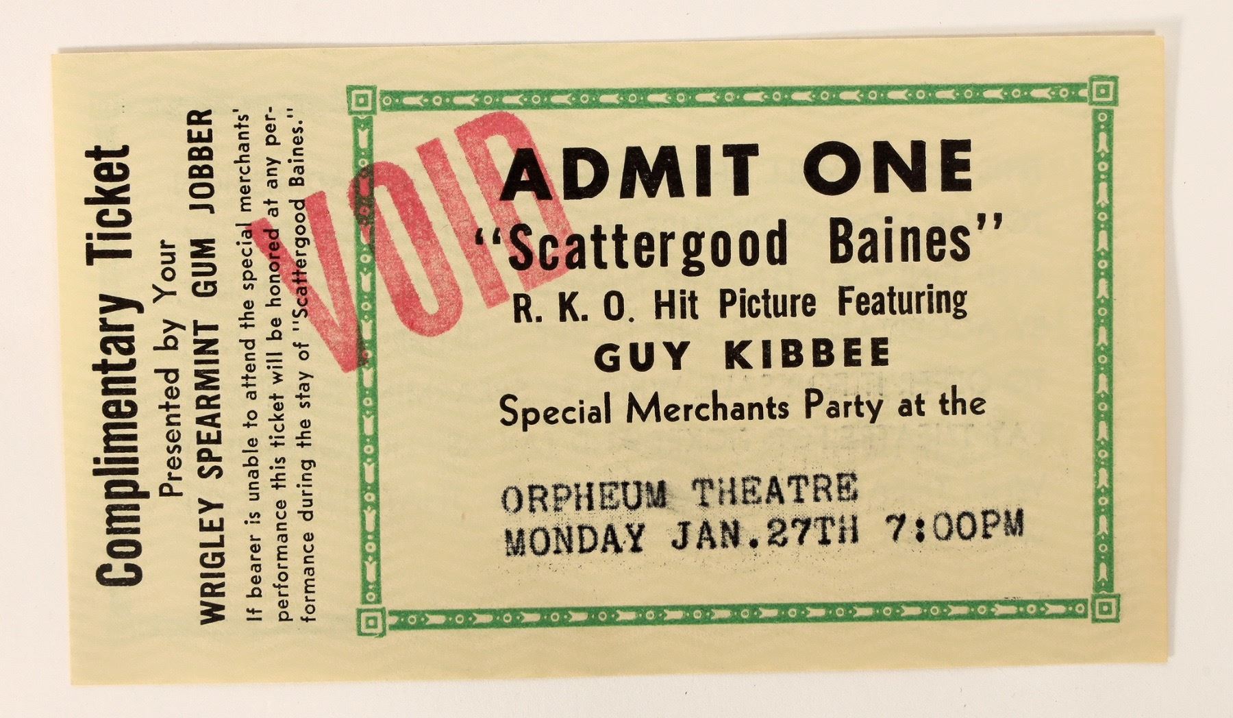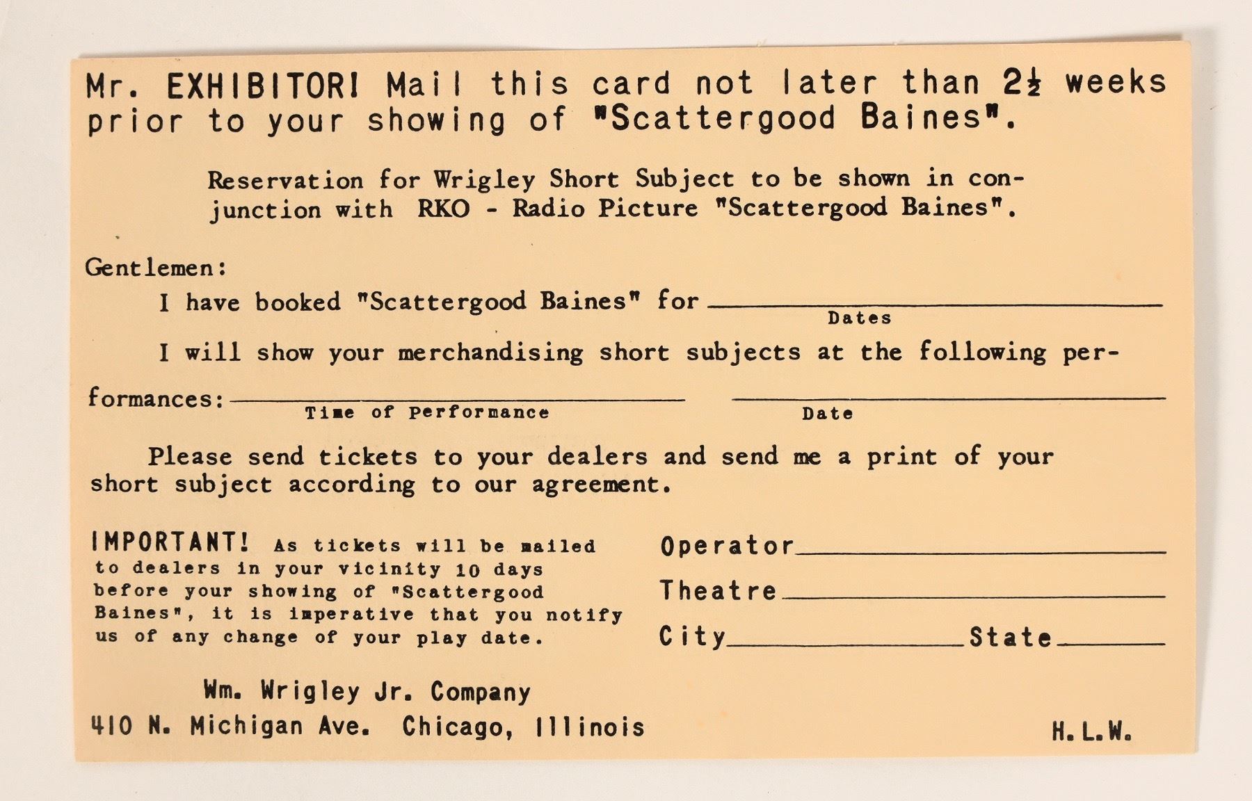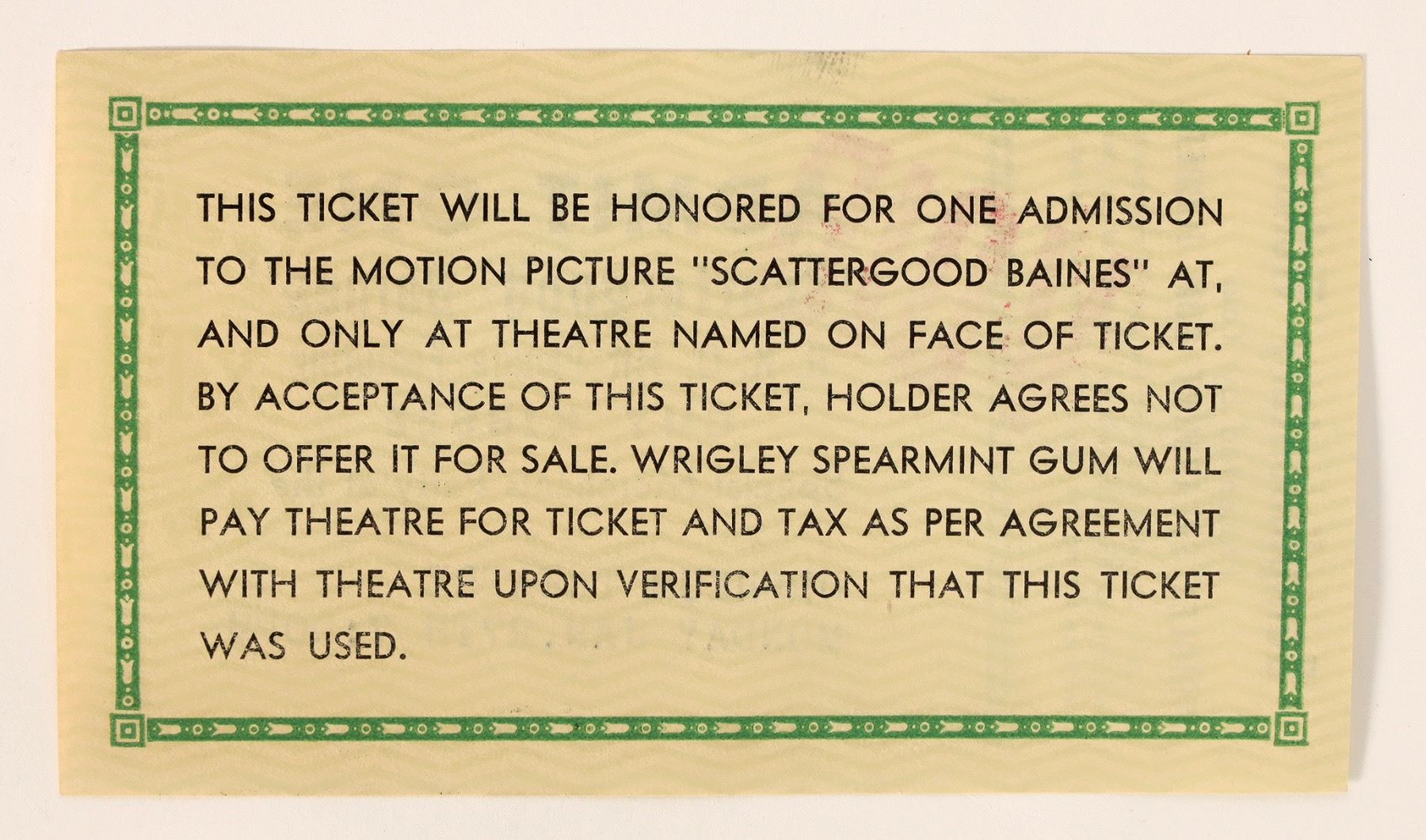 1941 Wm. Wrigley Jr. Company letter head related to tickets for a performance of Scattergood Baines along with a cover, sample ticket and contract.[