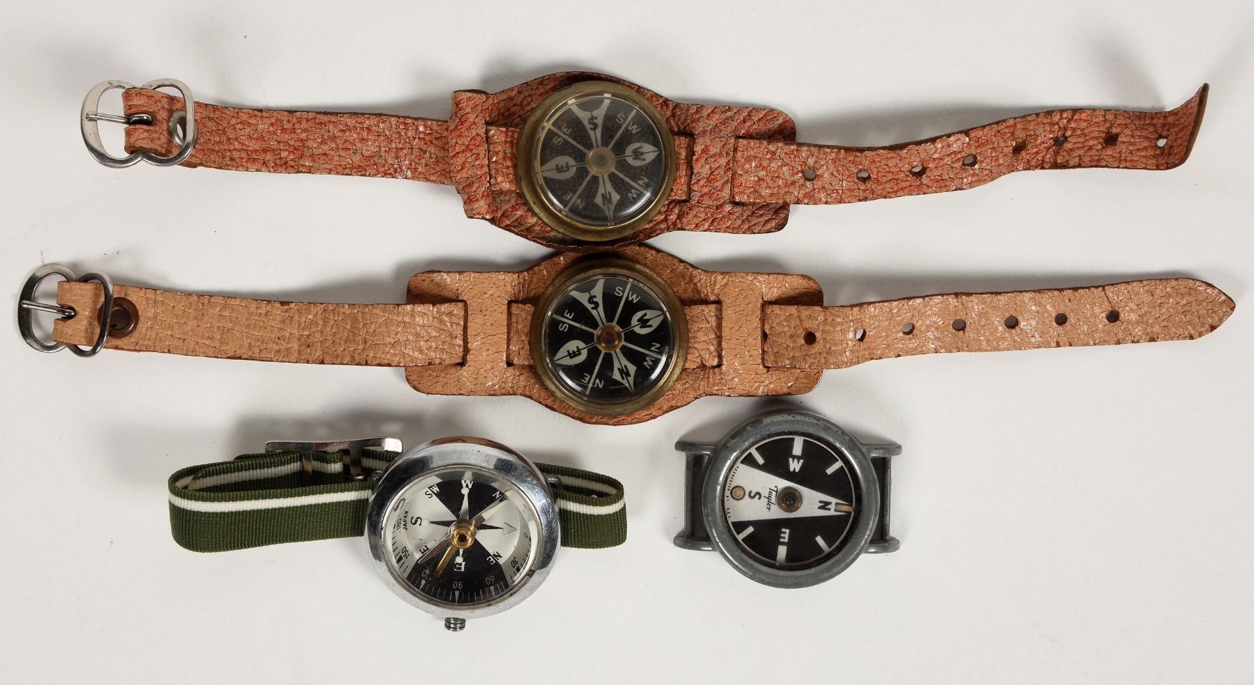 This lot has four wrist watch style compasses. Two with leather bands are made by Marbles Gladstone. One is made by Taylor without a wristband, and the fourth one is made in Japan no markers mark. All work well. Please see photo for details.