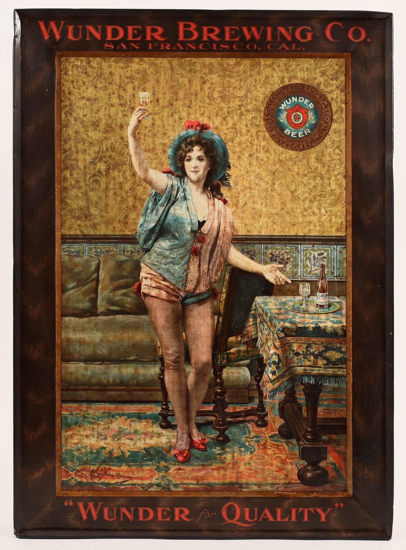 Original one side metal Wunder Brewing Co/San Francisco, Cal./"Wunder Quality" mounted on a back wood frame. Strong color and nice condition. A great back bar sign! Frame is 16 x 22 inches, the back is plain cardboard, no writing, no images. San Francisco California