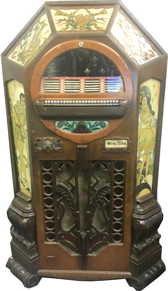 Fancy geometric designed Wurlitzer model 42 made in 1942. Fancy wood-carved front with rolling carved legs and five original reverse glass painted panels. Overall size 28”, deep 42”, 66” tall. Coin slot in the front in-operative. The machine has been restored to working order and plays beautifully. This Wurlitzer is another show piece. It plays and displays beautifully with the lighted panels and 24 record changer. The Wurlitzer was invented by the Wurlitzer family of Saxony, musical instrument manufacturers since the 1600’s. In 1896 they created the first electrical coin-op piano, and in 1933 came up with the coin-op electrical phonograph. This model is considered by many of the advanced collectors as the key piece in the Wurlitzer suite of coin-op electrical phonographs. We have videos of the two Wurlitzers available on our web site, fhwac.com This piece came from a prominent Southern California Collection. Date: Location: HWAC# 75216