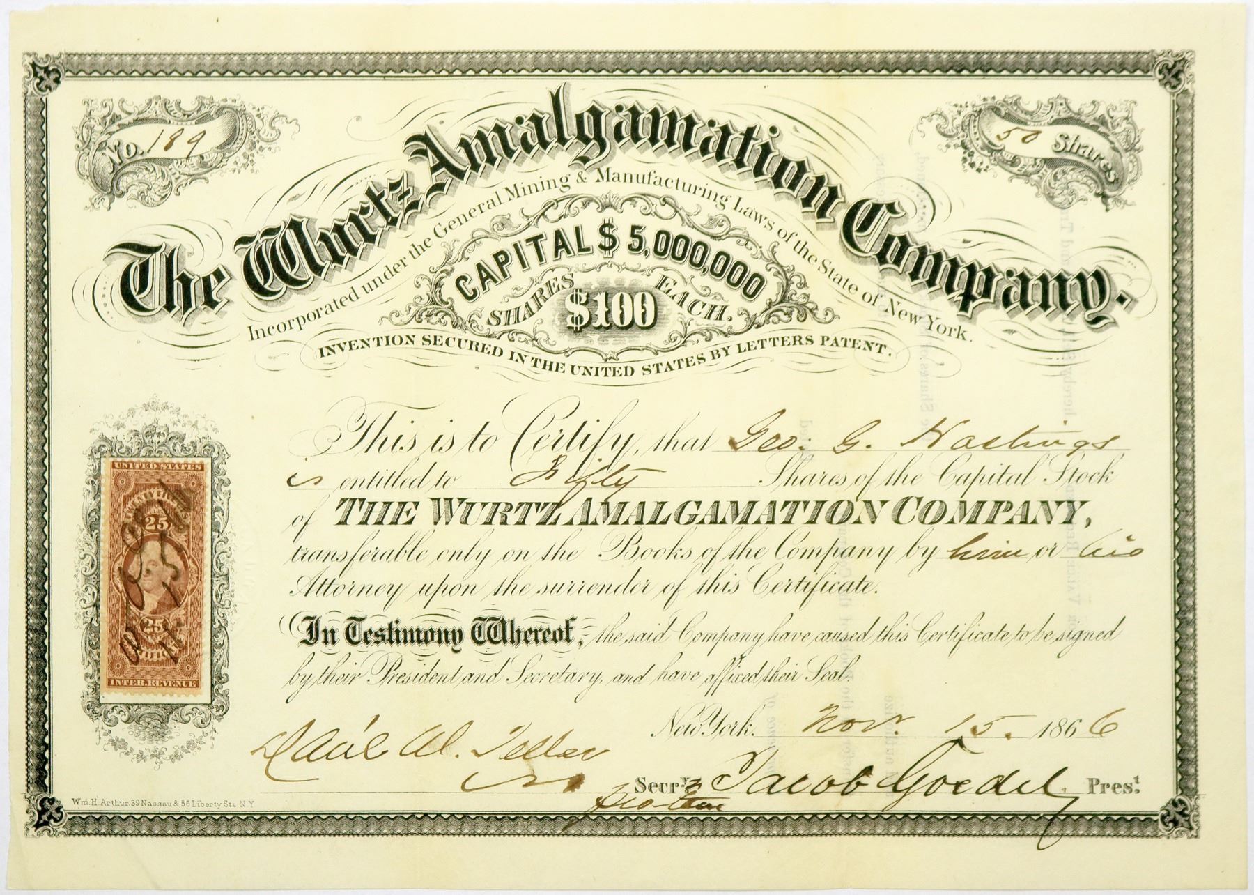 Cert. #189, issued for 50 shares to Geo. G. Hastings in 1866. Signed by Jacob Goedel as president. In 1865, Henry Wurtz, of New York invented a new and improved method of extracting gold and other precious metals from their ores and from other materials by amalgamation. The method consists of adding a minute quantity of highlyelectro-positive metals such as sodium, potassium, lithium, caesium, barium, strontium etc. to the quicksilver used for the amalgamation of gold, silver and other precious metals. This invention was patented. The company was incorporated the year after. The company incorporated in New York and on the header it states, "Invention Secured In the United States By Letters Patent." We last had one of these in 2001, so it is very rare. A quite historical piece in the history of mining. VF. Uncanceled. Date: Country (if not USA): State: New York City: Provenance: