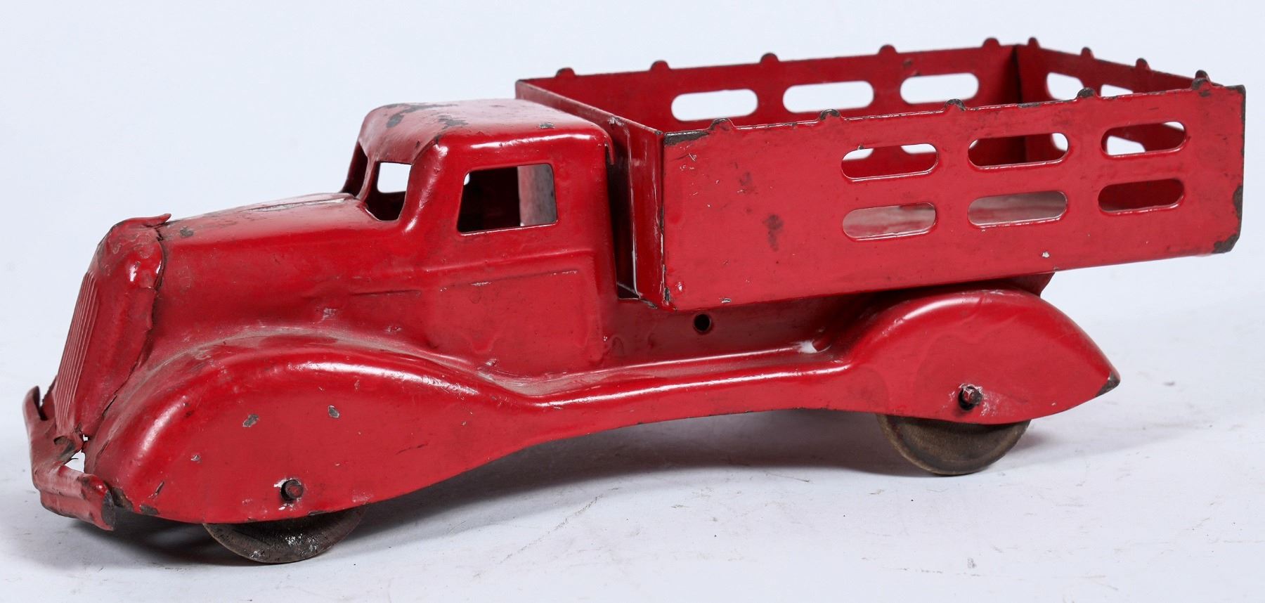 Wyandotte Stake Truck, 1940s, pressed steel, light play wear, paint chips to top of cab as shipping damage. Scarce. 11" long.