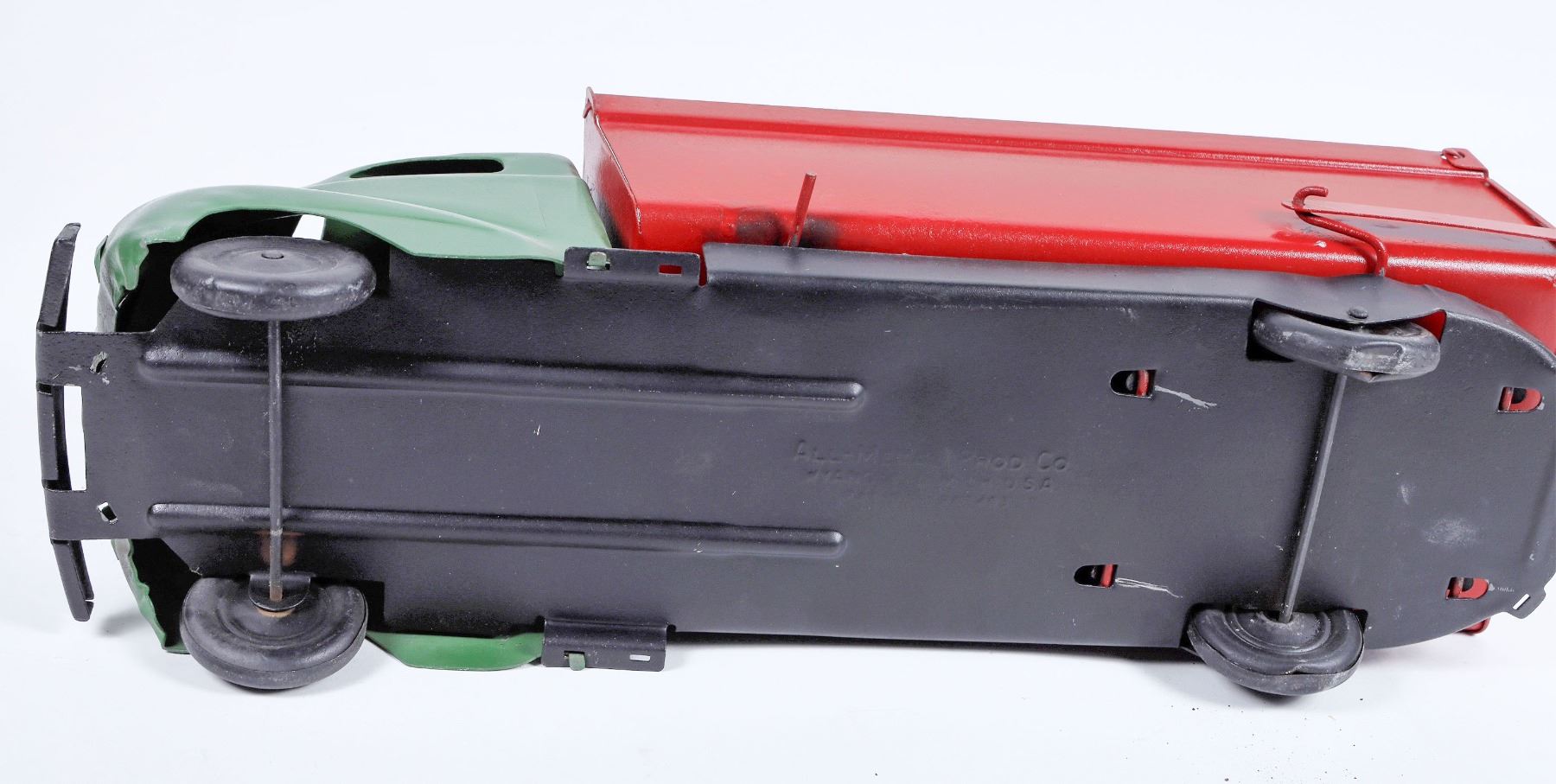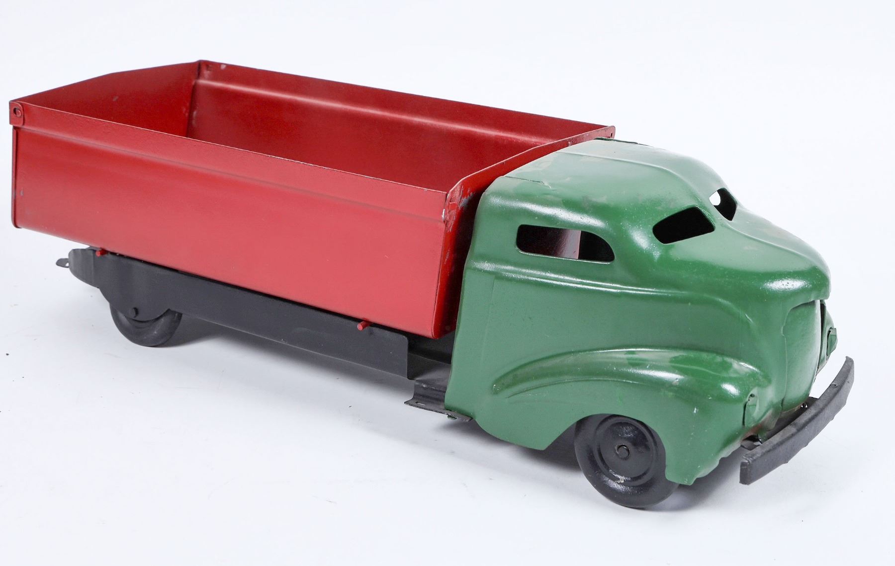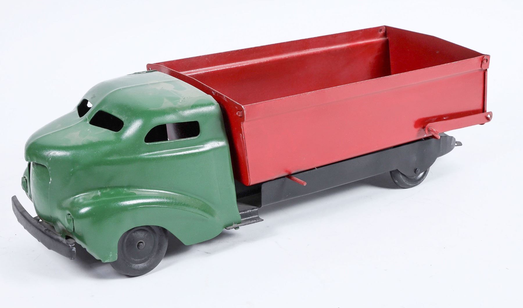 Wyandotte pressed steel rear dump truck. Red/green, exc. cond. no paint clips or wear-possible repaint. No dents to rust. Operating order. 21 1/2” L