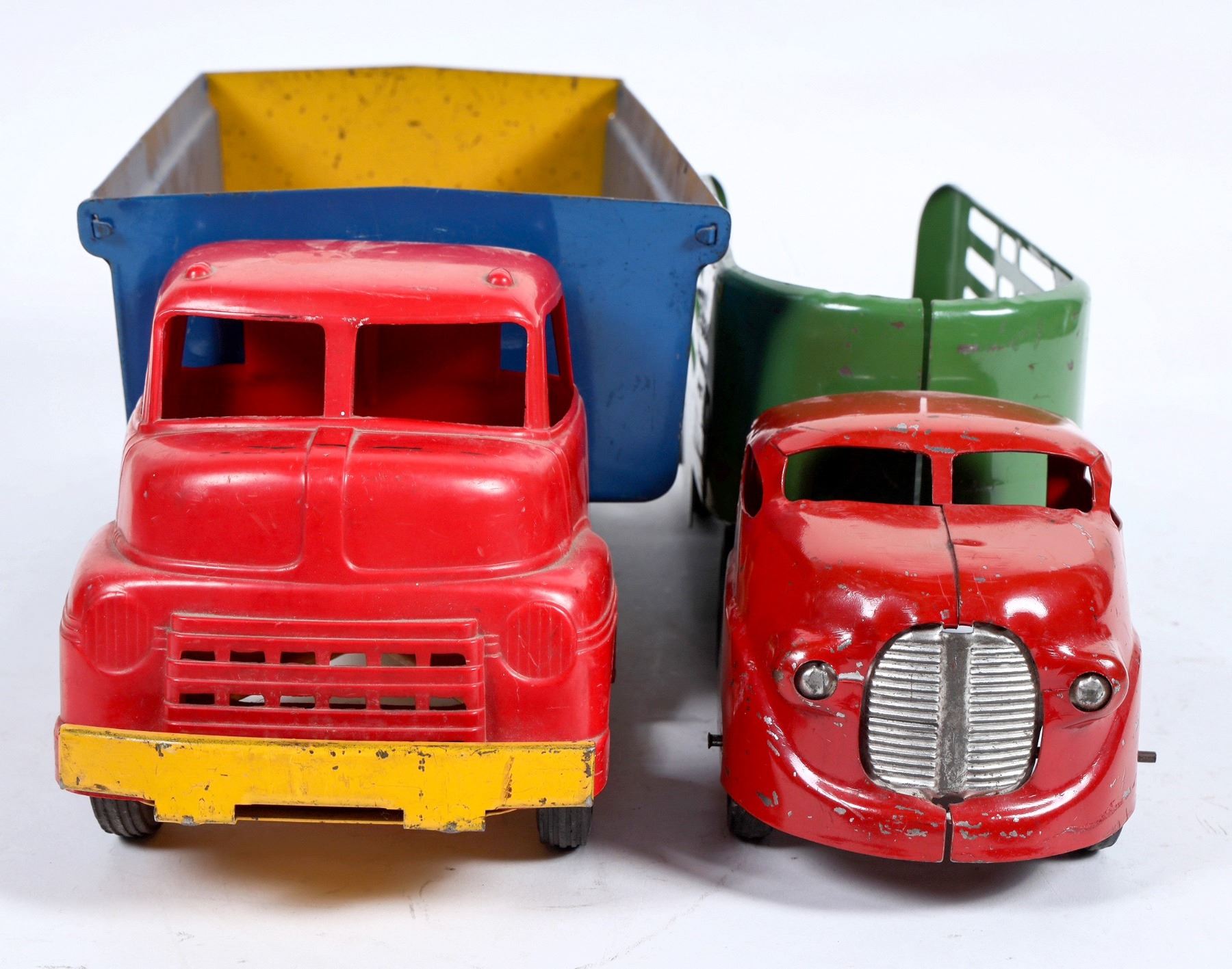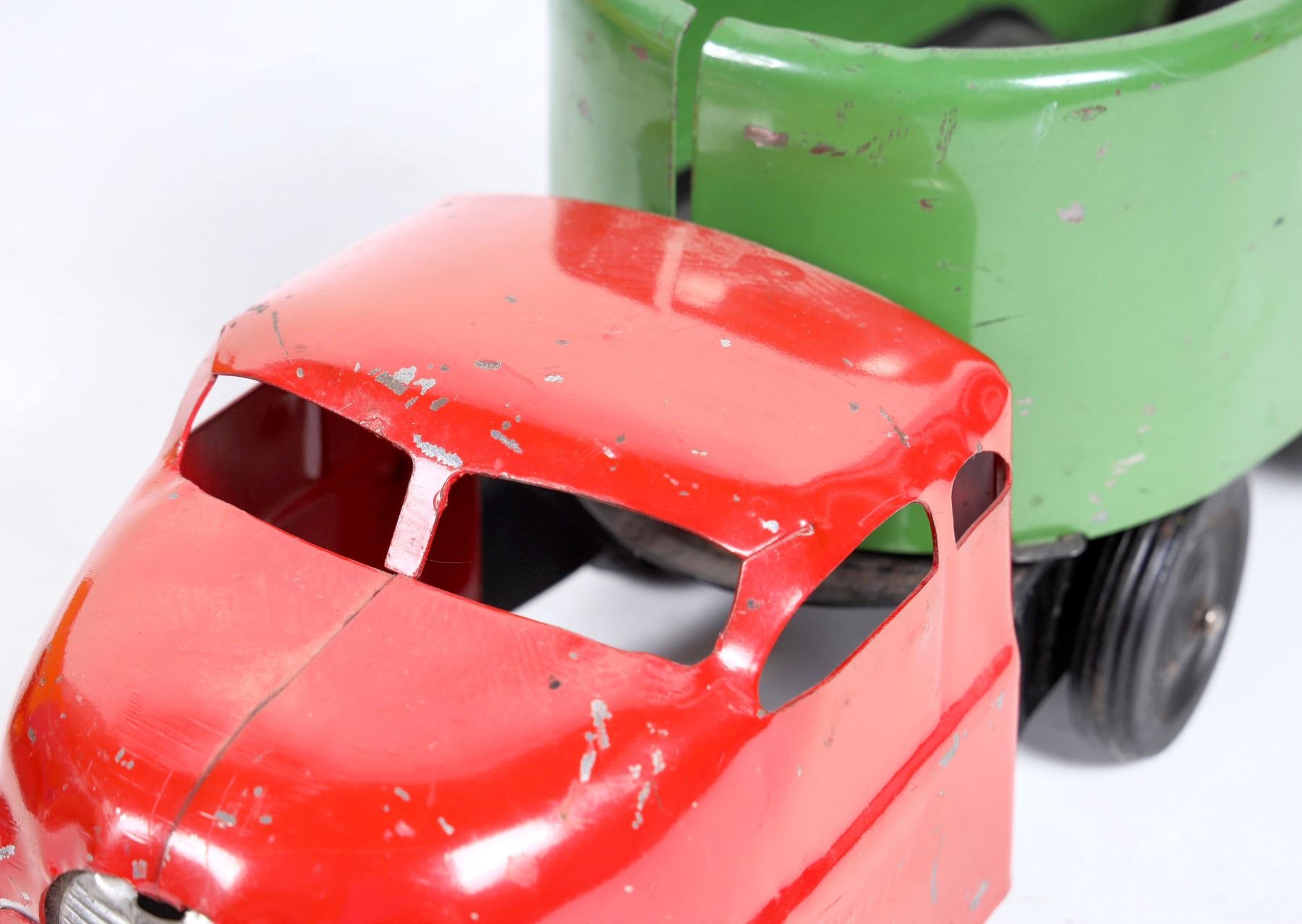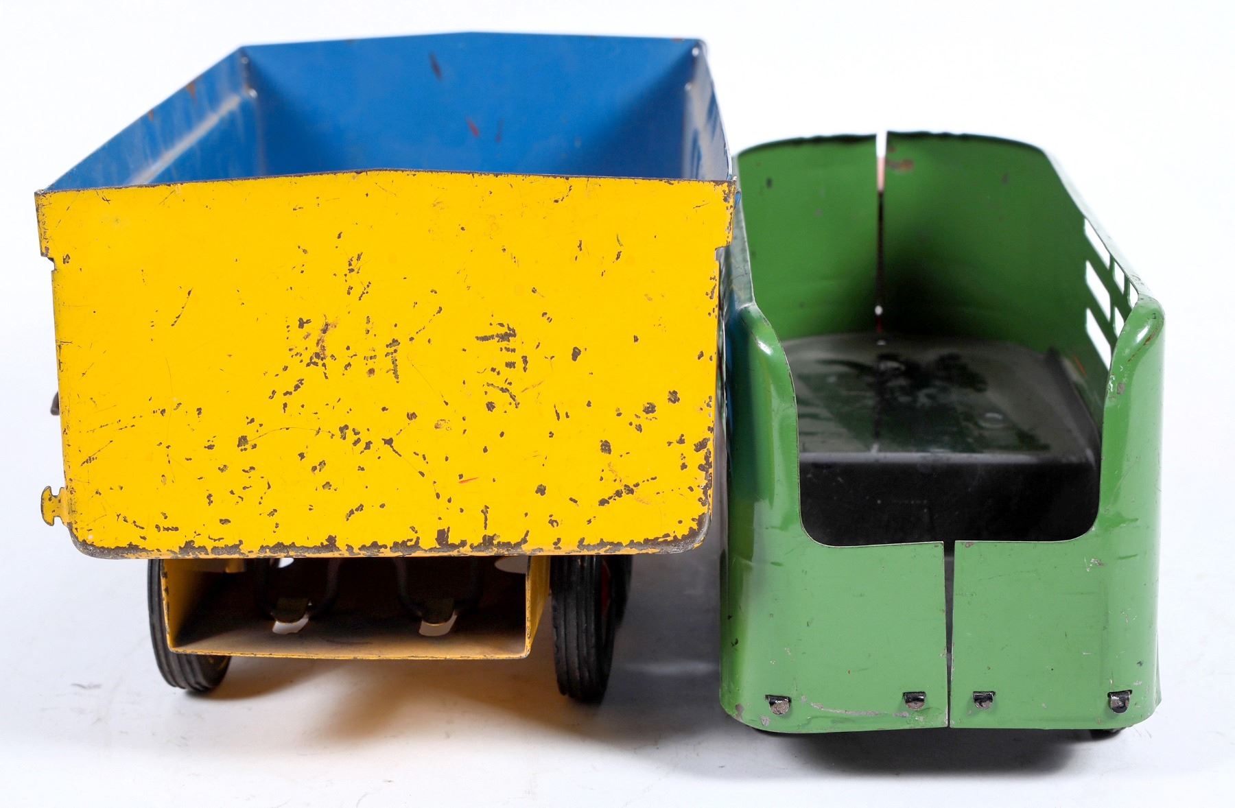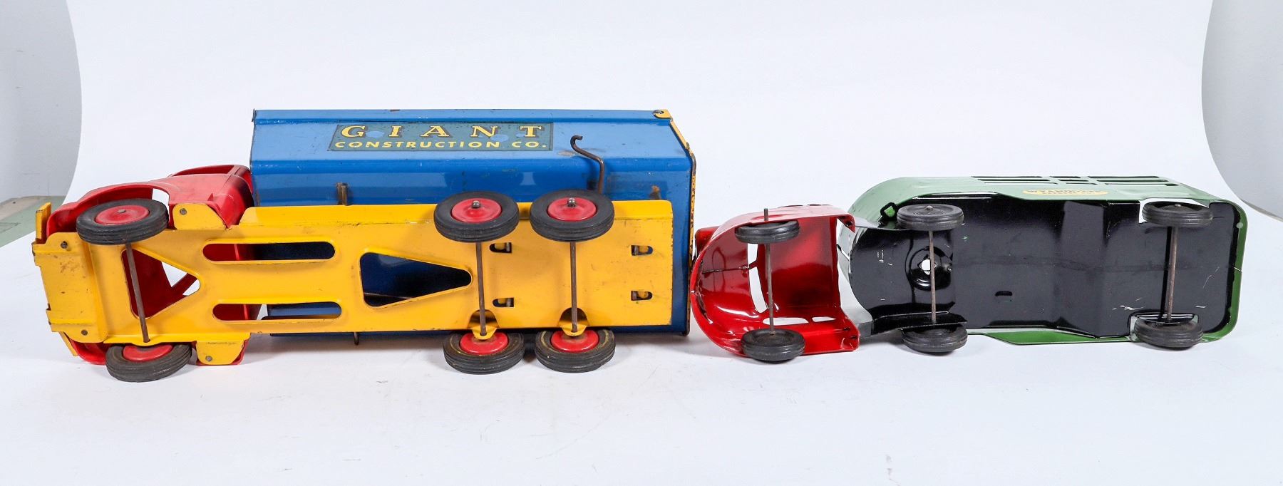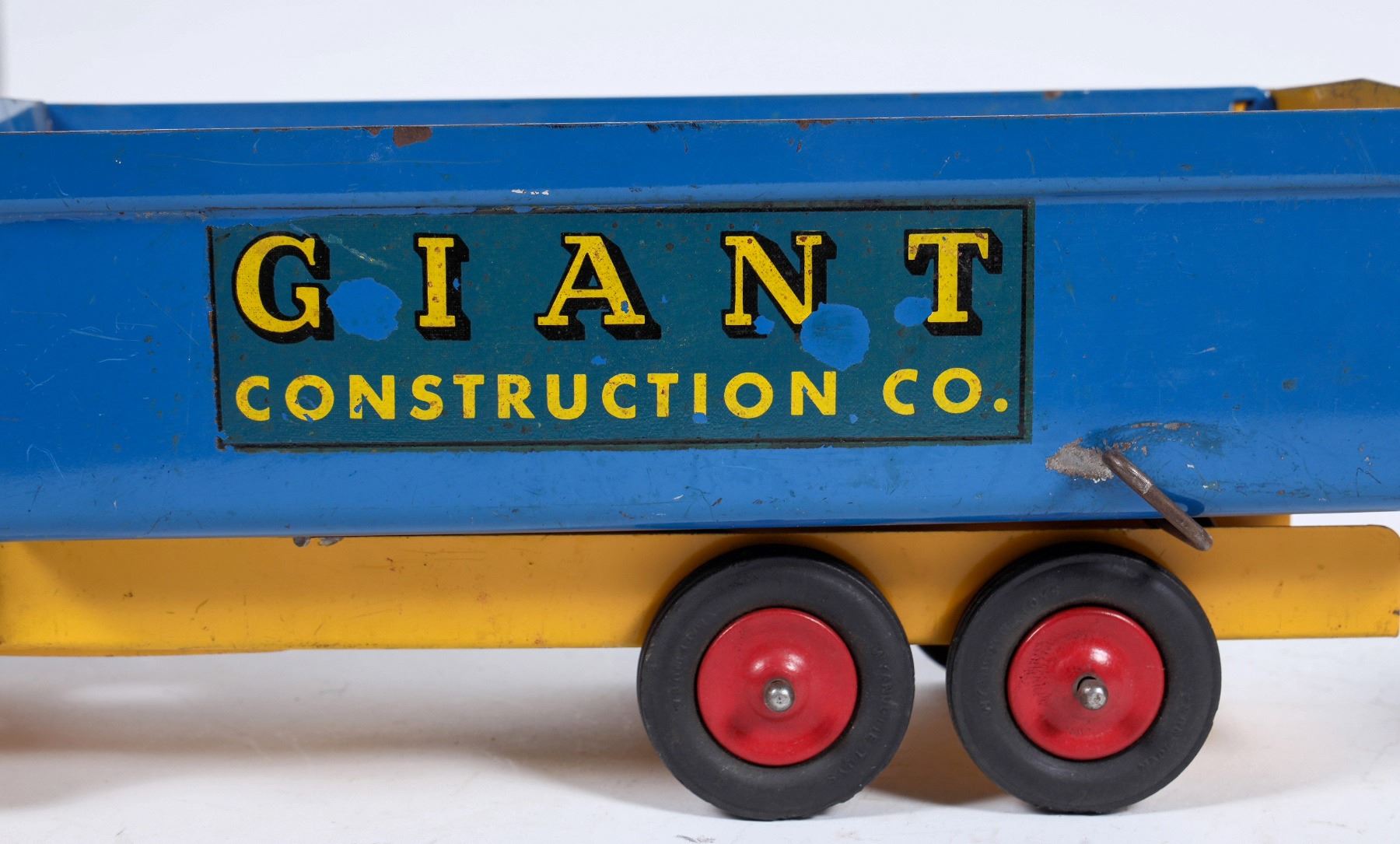 2. Wyandotte Giant Construction Co. truck/trailer. pressed metal trailer, hard plastic truck. Decals close to excellent. bed near perfect. Light play truck. 20" long.