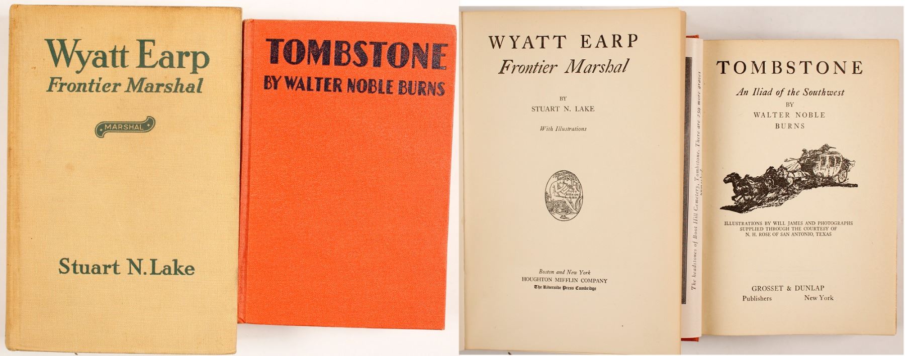 This lot contains two books on the Old West featuring Wyatt Earp and the town of Tombstone, Arizona. Burns, Walter Noble. Tombstone, An Illiad of the Southwest. Grosset & Dunlap, 1929, 388 page, draws its many stories from the archives of the Tombstone Epitaph and Nugget newspapers, and the Tucson Star newspaper. It includes a narrative of the Earp-Clanton feud that ended in the famous shootout at the OK Corral which is based on witness testimony from the subsequent trial. The author also draws from manuscripts and other documents to chronicle the founding of the Town to Tough to Die. Lake, Stuart N. Wyatt Earp: Frontier Marshal. Pockett Books, 1931, 392 pages, recounts the life and times of Wyatt Earp that made him a myth of his own era, a legend while he lived, and an icon of the American West. It is the most important and thoroughly researched books on Wyatt Earp that exists.