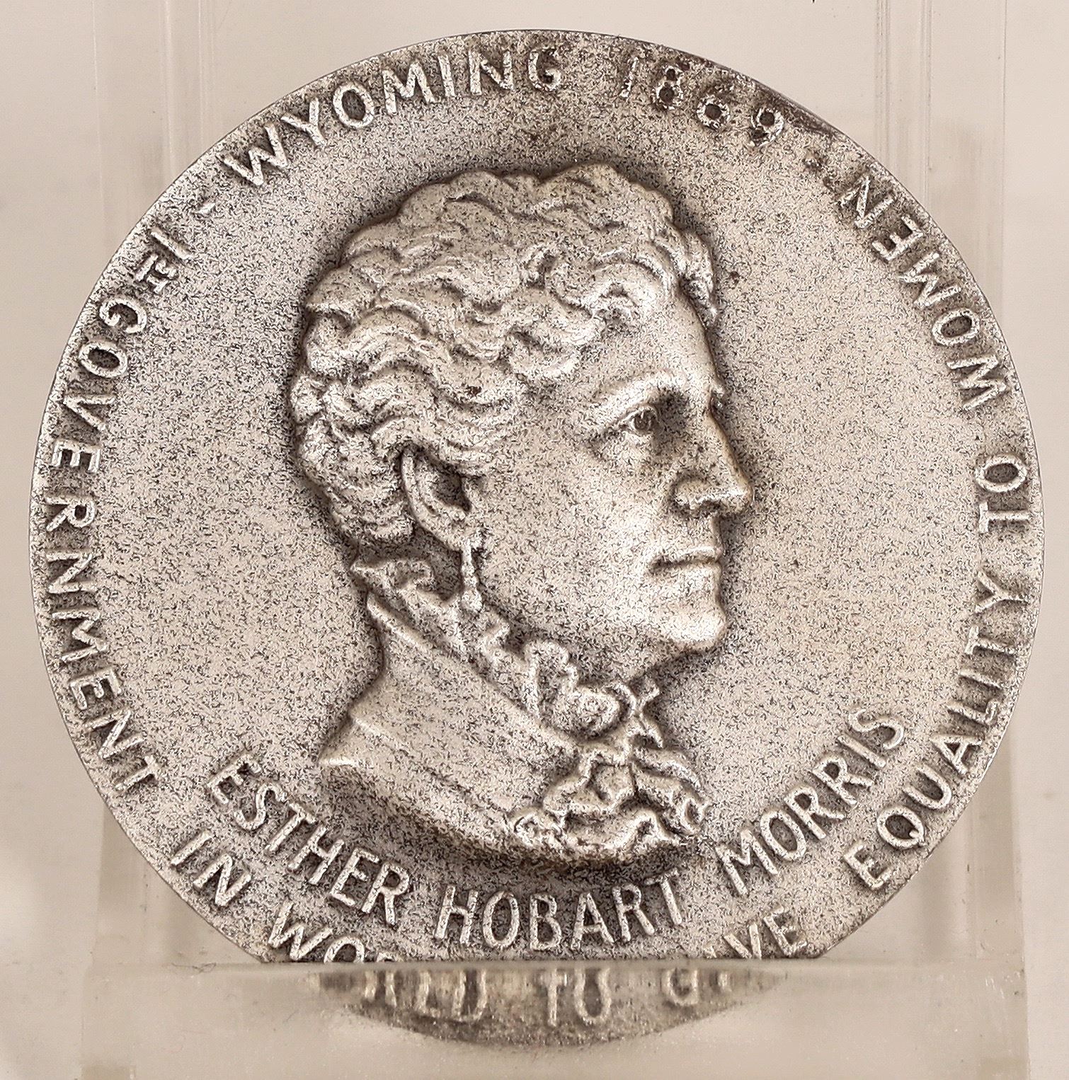 Made by Medallic Art Company of New York. Obv.: Esther Hobart Morris / 1st Government In World To Give Equality To Women / Wyoming 1869; Rev.: 1890 / 75th Anniversay / 1965 // God West / Go Wyoming. Silver (.999); round; 44 mm; 57 grams; in original box.