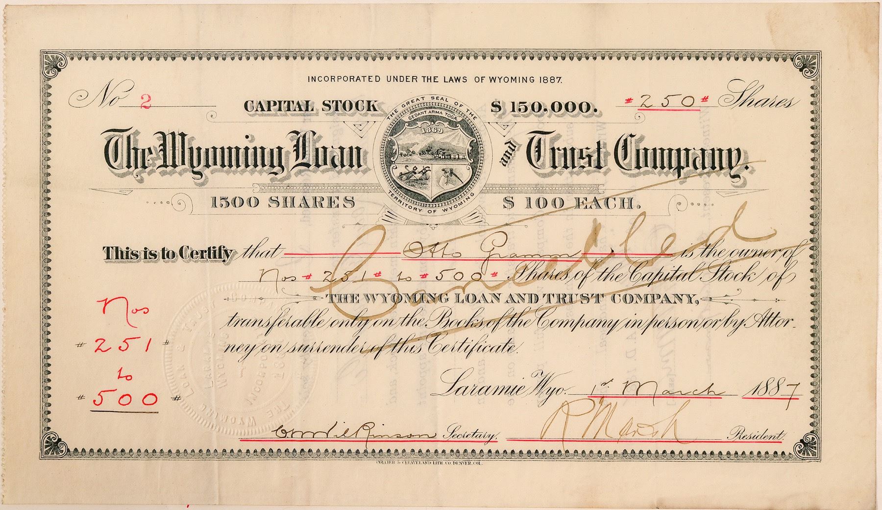 Low number 2, issued for 250 shares to Otto Gramm on March 1st, 1887 in Laramie. Signed by president R. Marsh and secretary Rinson. Pen cancelled. Black border and print. State seal vignette. Printed by Collier & Cleaveland, Denver. 6 x 10.5" Folds. Robert Marsh was born in England around 1850 and came to Laramie in 1868 to work as a timekeeper for the UPRR. As Marshís business interests prospered, he left the railroad, became the manager of the Pacific Market, dabbled in ranching. Marsh and his partner Frank Cooper became well known through their enterprises which included a market, ranches, and a slaughterhouse. Otto Gramm was an infamous businessman in Laramie. In 1870, he purchased Dr. Finfrock’s, a successful drug store in Laramie. In 1880, he added a soda fountain, which became a longtime fixture in the Laramie community. Gramm later opened the first bottling company in Laramie. A Republican, he served as probate judge in Laramie, treasurer of Albany County and was appointed State Treasurer in 1890, a position he held through 1895. He also served on the Board of Trustees for the University of Wyoming. In the early 1900s, Gramm had a contract with the State of Wyoming to operate the State Penitentiary in Rawlins. The conditions in the new prison were horrible. Gramm received $.57 per day per prisoner from the state, plus the profits from the facility’s broom works where the inmates worked. The broom works was burned down by the prisoners in 1912. It came to light that the prisoners under Gramm’s charge were given just enough food to prevent starvation. Ken Prag Collection