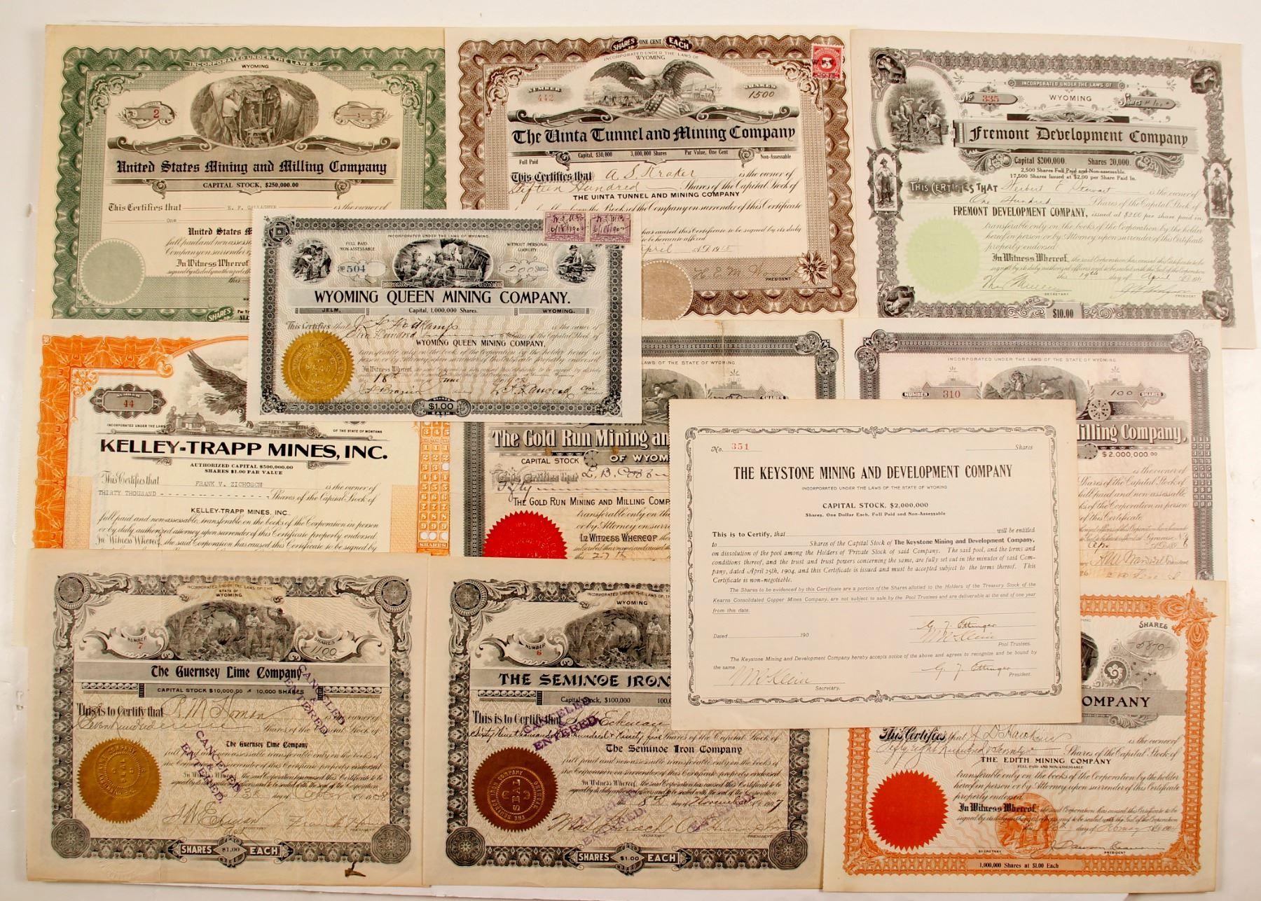 Wyoming Mining common stock - 11 stocks. 1) Two hundred shares of Wyoming Queen Mining Company, number 504, signed on June 18, 1902 with revenue stamps, 2) Fifteen hundred shares of Unita Tunnel and Mining Company, Number 442, for A. S. Kraker, signed on April 19, 1915 by H. E. M. Wood, president, with revenue stamps 3) One share of United States Mining and Milling Company, number 2, for E. F. Gallagher signed on January 2, 1929. by Lewis Flader, president. Printed: W. H. Kistler Stat'y Co. 4) One hundred shares of Fremont Development Company, number 335 for Herbert E. Stewart, signed on April 19, 1911, 5) Unissued shares of Keystone Mining and Development Company, number 351, signed by G. F. Ettinger. 6) Thirty thousand shares of Kelly-Trapp Mines, Inc, number 44 for Frank V. Zichosch, dated January 25, 1943 signed by Patrick A. Trapp, president. Printed: Dwight & M. H. Jackson. 7) Five thousand eight hundred seventy shares of Edith Mining Company, number 128, signed on February 26, 1904. 8) Cancelled sixty-nine thousand, nine hundred ninety-five shares of Seminoe Iron Company, number 6 for S. W . Ellmon, Trustee, dated November 8, 1907, transferred April 3, 1908 . 9) Cancelled eleven hundred shares of Guernsey Lime Company, number 7 issued to R. M Homan on October 13, 1908, signed by Frank Homan, president. 10) One hundred shares of Gold Run Mining and Milling Company, number 310 for L. B Irvin, dated April 20th, 1896, A W Manwell, president. 11) Fifty shares of Gold Run Mining and Milling Company, number 939, signed October 27, 1899 with revenue stamp. Wyoming’s mining industry has previously and will continue to play a big role in the economy of the state. Minerals are taxed at the full value. Ken Prag Collection. State: Wyoming City: Date: HWAC# 82304