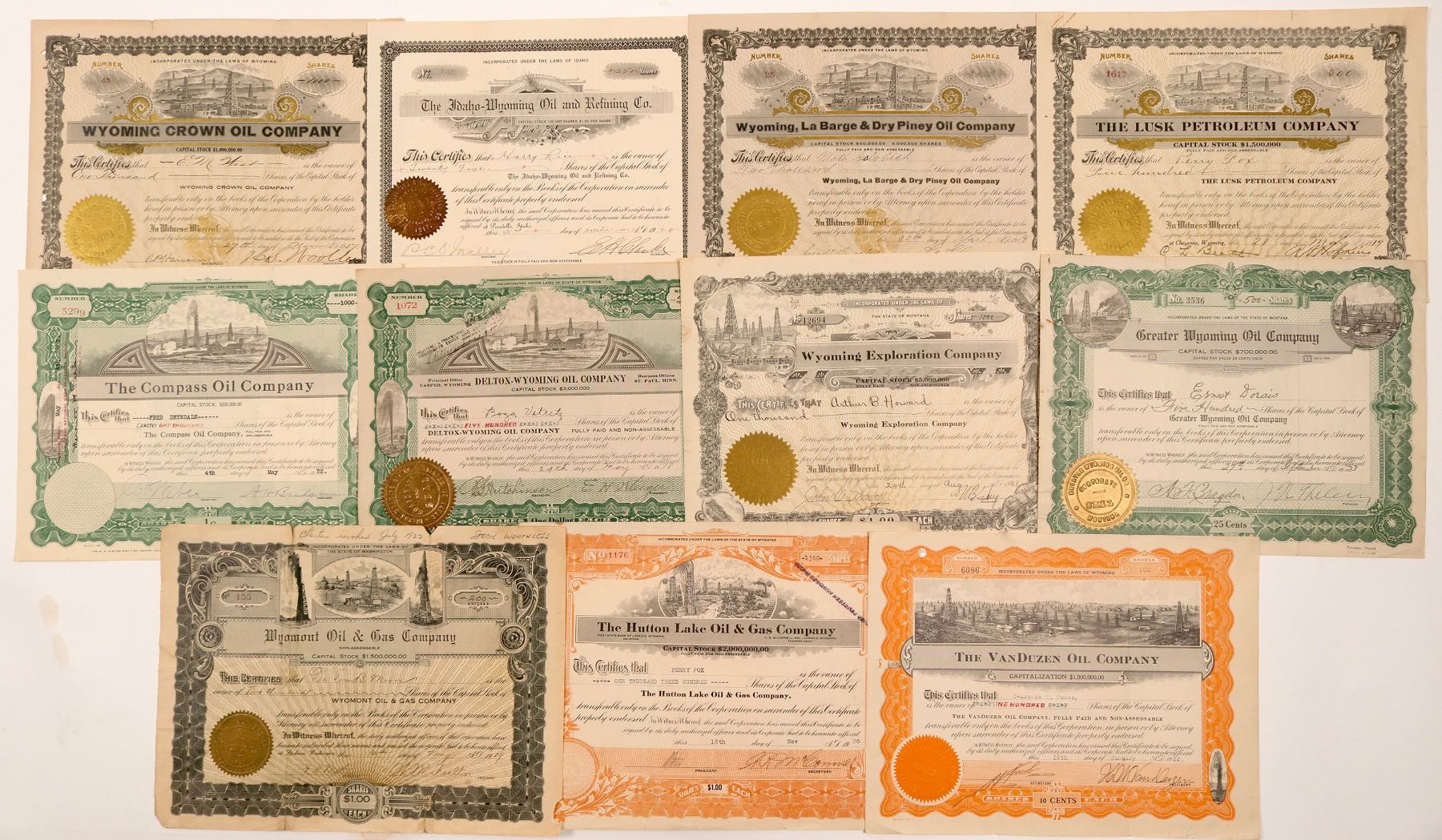 Lot of 11 different. Nearly all have oil vignettes. Included: Idaho-Wyoming Oil & Refining Co. (1917); Wyoming, La Barge & Dry Piney Oil Co. (1918); Lusk Petroleum Co. (1919); Wyomont Oil & Gas Co. (1919); VanDuzen Oil Co. (1922); Hutton Lake Oil & Gas Co. (1920); Greater Wyoming Oil Co. (1923); Wyoming Exploration Co. (1921); Deltox-Wyoming Oil Co. (1918); Compass Oil Co. (1922); and Wyoming Crown Oil Co. (1917). Fair to good condition. Please inspect. Ken Prag Collection