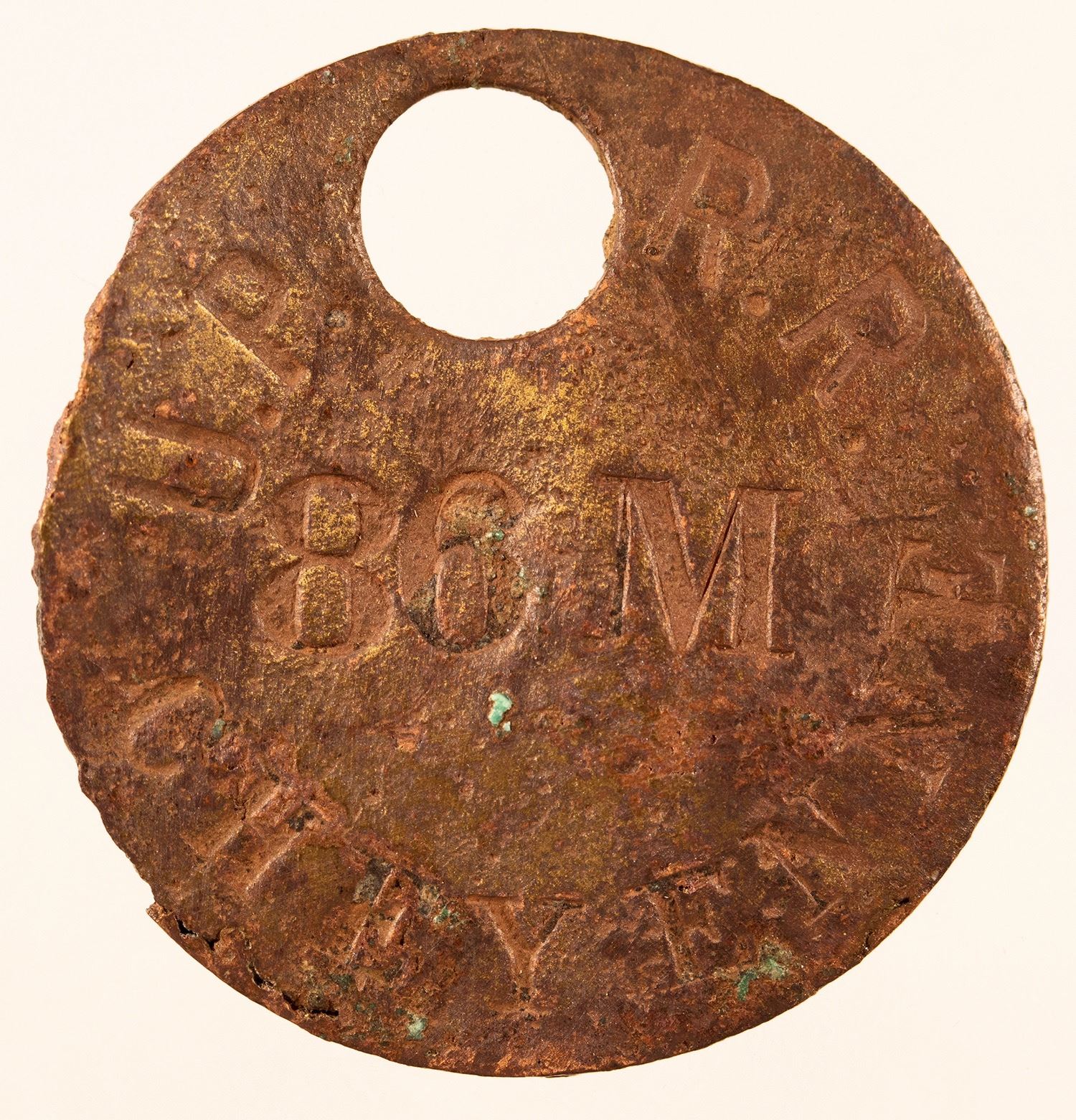 Round copper fob. U P R R. 88M, Cheyenne. 1 1/8". Bent.