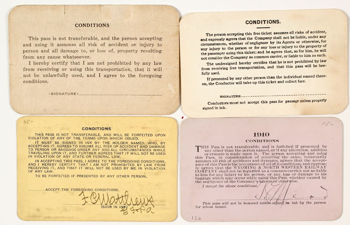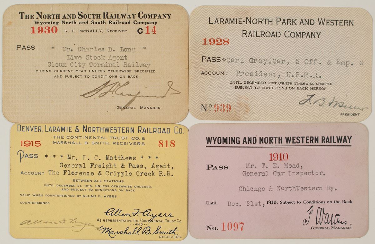 Lot of 4 different. Included: Wyoming & North Western Railway (1910); Denver, Laramie & Northwestern Railroad Co. (1915 to FC Matthews of Florence & Cripple Creek RR); Laramie-North Park & Western Railroad Company (1928 to president of Union Pacific); and Wyoming North & South Railroad (1930). Please see photo for conditions. (Prag Collection) City: State: Wyoming Date: Inventory# 39408