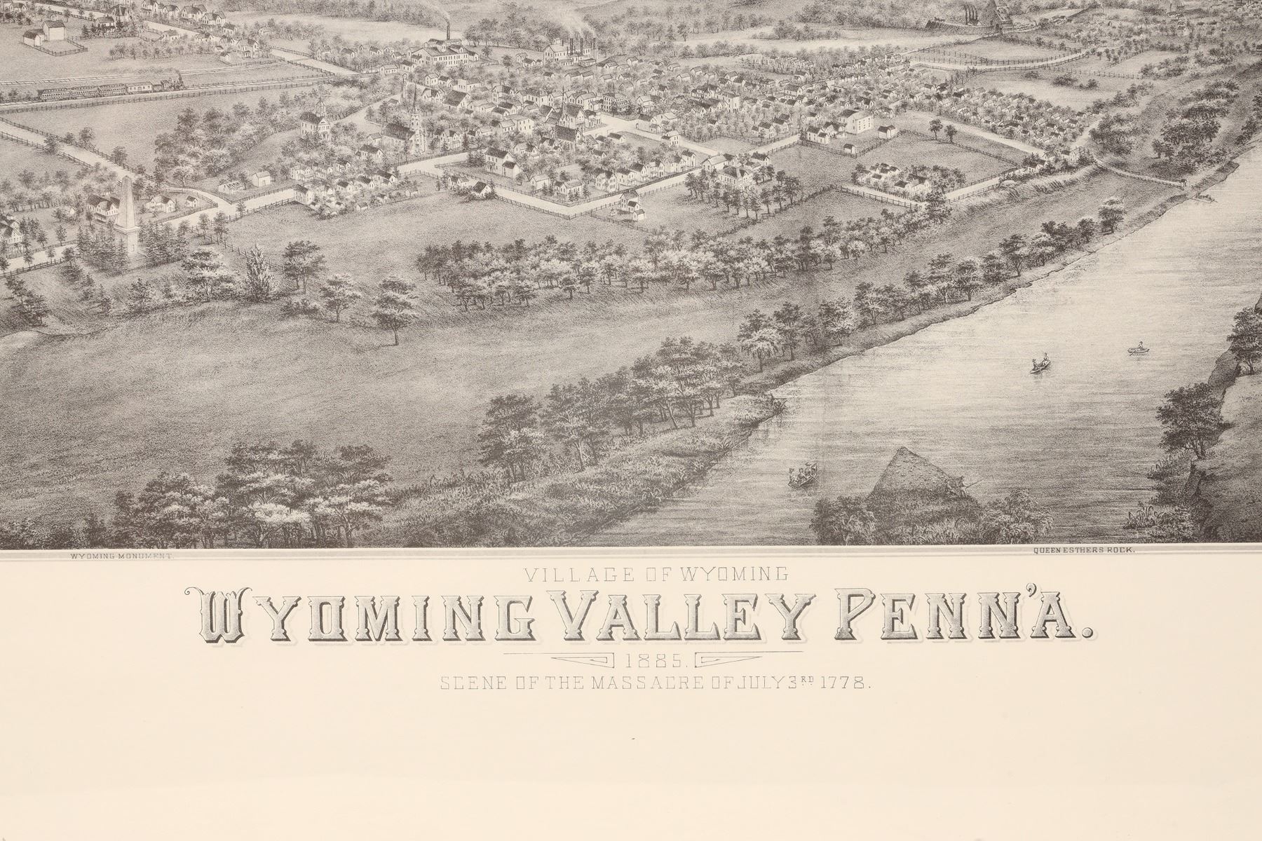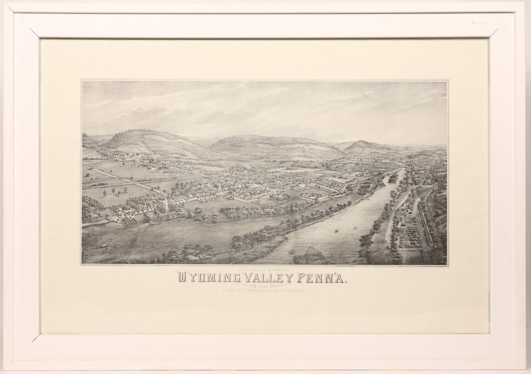 Beautifully framed reprint litho of Wyoming Valley, scene of the July 3, 1778 Massacre in which British soldiers killed hundreds of settlers in this valley during the Revolutionary War. Originally copyrighted to Rowley, utica, NY and printed by Vogt & Sons, Lithographers, this litho was so popular that fine quality reprints were made, all so well done that is near impossible to tell the difference. Overall size 28.5 x 41"