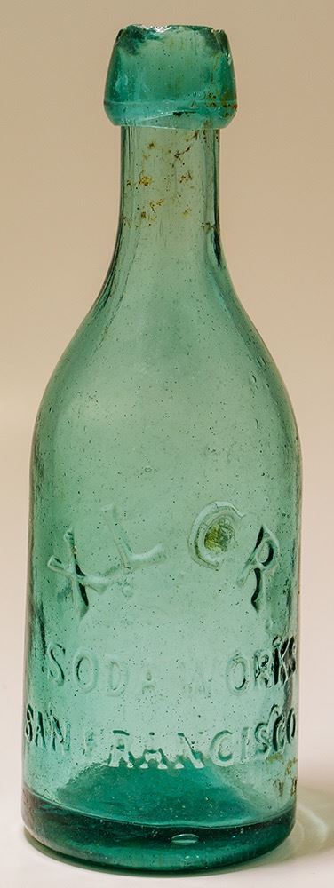 XLCR Soda Works, San Francisco. This is a choice dark aqua example of the XLCR with a little bit of green and amber in the glass. Unfortunately, it has a chipped top from numerous ice pick cork removals. The bottle is not punch old but has an applied top. Extremely rare XLCR was produced from 1861-1872. It was produced by Louis Braider & Co. who ran the Excelsior Soda Works. The bottle is considered extremely rare today. This bottle has a lot of character in the glass and some whittle. City: San Francisco State: California, Date: Inventory# 40905