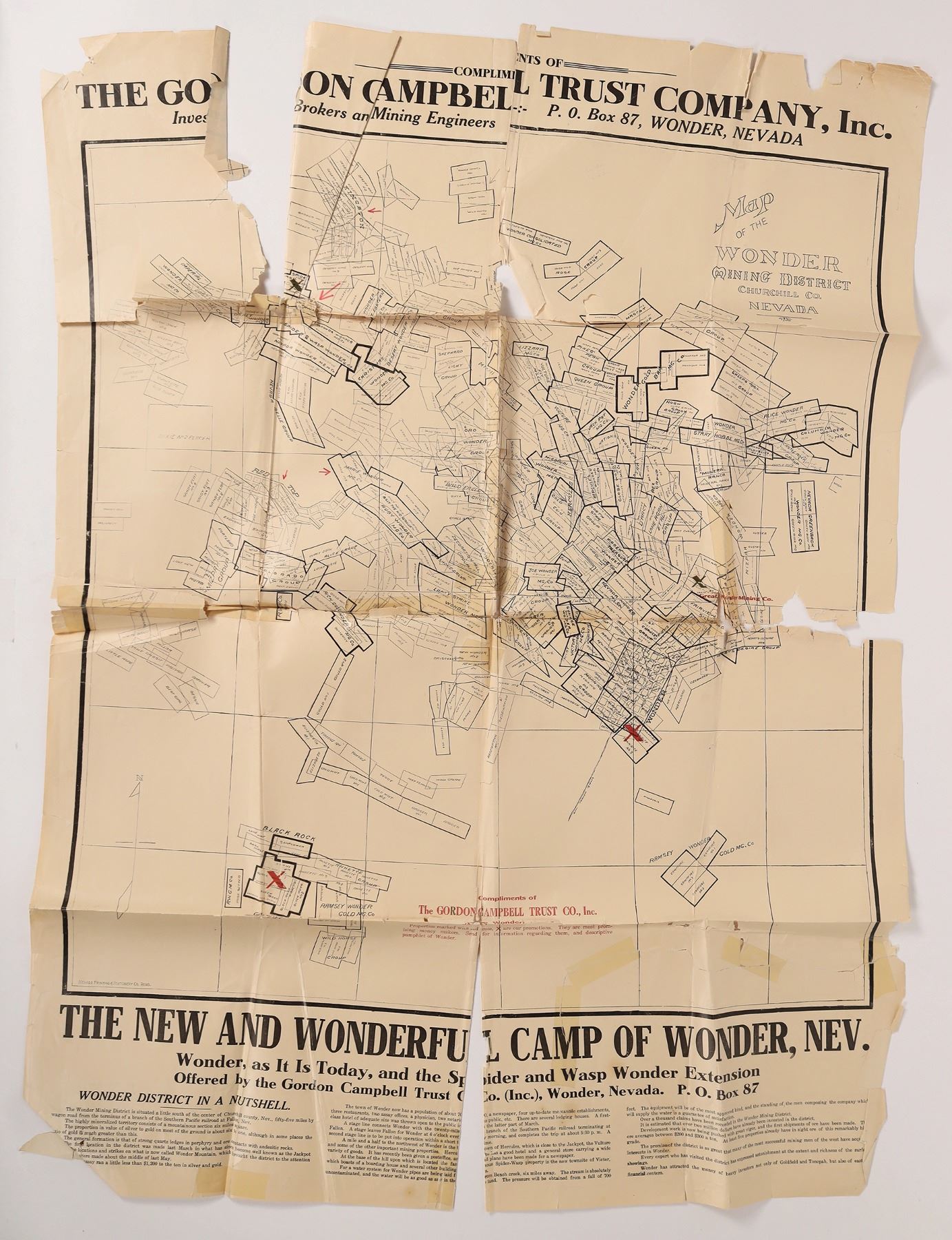 36 x 26". Has holes, tape, rips and red arrows - presumably from Shamberger on his trips to Wonder while writing his book. Printed by the Gordon Campbell Trust Company. Called the "New & Wonderful Camp of Wonder". Shows well over one hundred claims. Campbell's claims include the Spider Wasp, Black Rock, Townsite, and Great Wonder. Handwritten arrows point to the Red Top, Towns, and Marie Wonder. Map must have been well used by Hugh in his trips to Wonder when writing his book. From the personal collection of Hugh Shamberger. Needs restoration. This is extremly rare. Wonder Nevada