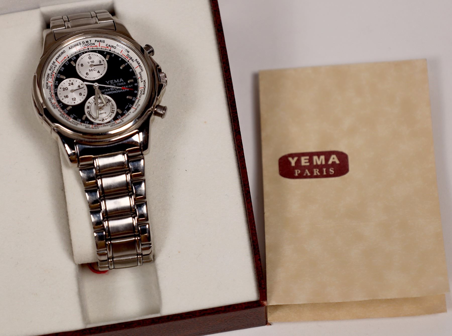 Stainless steel wrist watch made by YEMA (Paris, France). 50mm quartz, World Timer -- has names of prominent cities throughout the world on outside of dial along with three inner dials against a black face. Back of watch reads MVT Quartz, N94J, 5 ATM, 50 YEMA, kwr001p, St Steel Base Metal Bezel. Included is box with Limited Warranty card along with a small red plastic tag with YKWR001P (serial number) on back. Note: not operational. State: City: Date: Provenance: