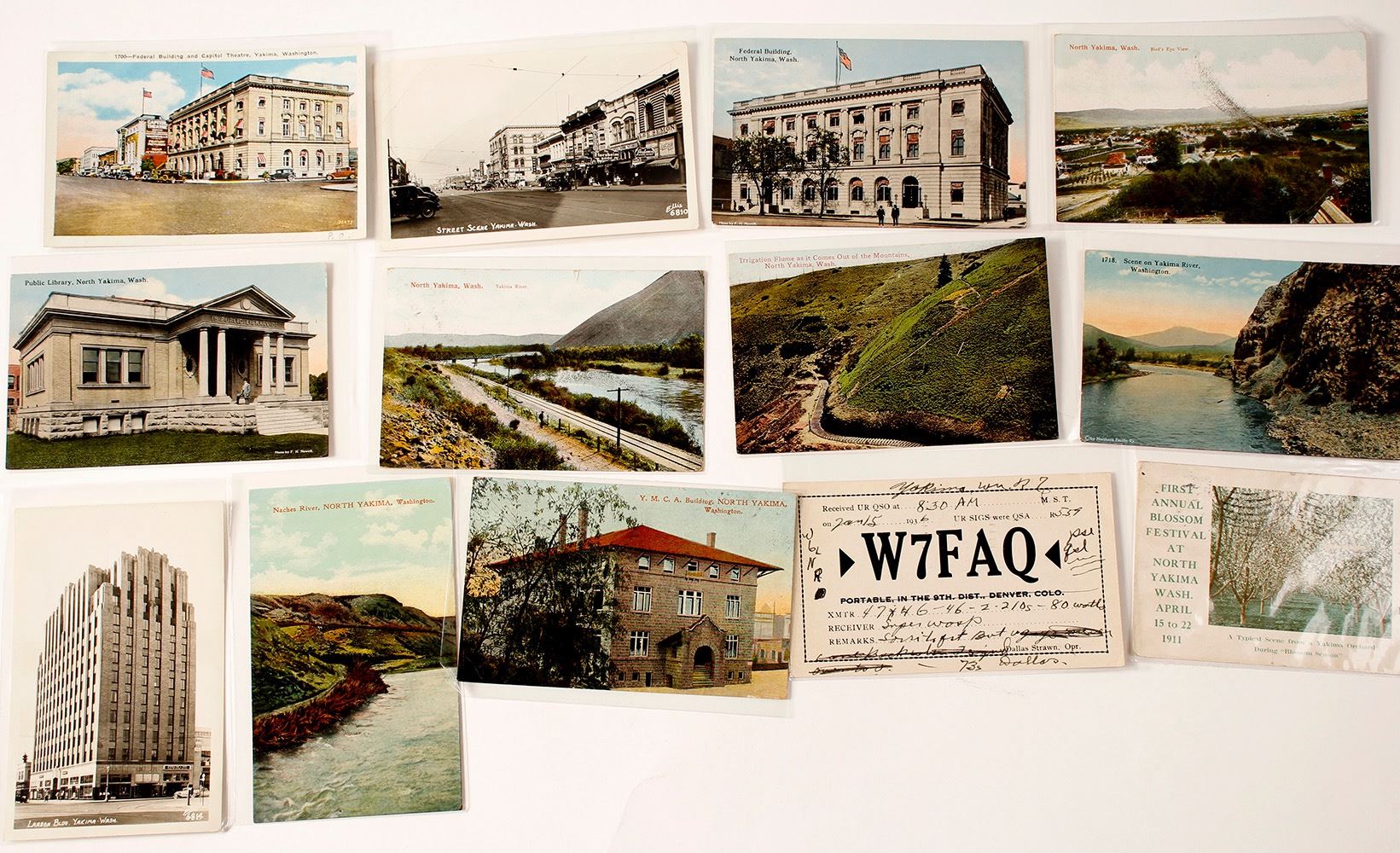 Lot of 13 different postcards with 2 real photo. RPCs are a c.1940s street scene (Ellis) and a shot of the Larson Building (Ellis). Eleven other cards, ten early printed plus one 1936 radio ID postcard. Rarest card is one for the First Annual Blossom Festival in 1911. Other cards have views of the Yakima River, a birds-eye, irrigation flume, and different buildings (federal, YMCA, public library). Eight cards mailed, 1908-1940. (Prag Collection) Date: Location: Yakima, Washington HWAC# 55477