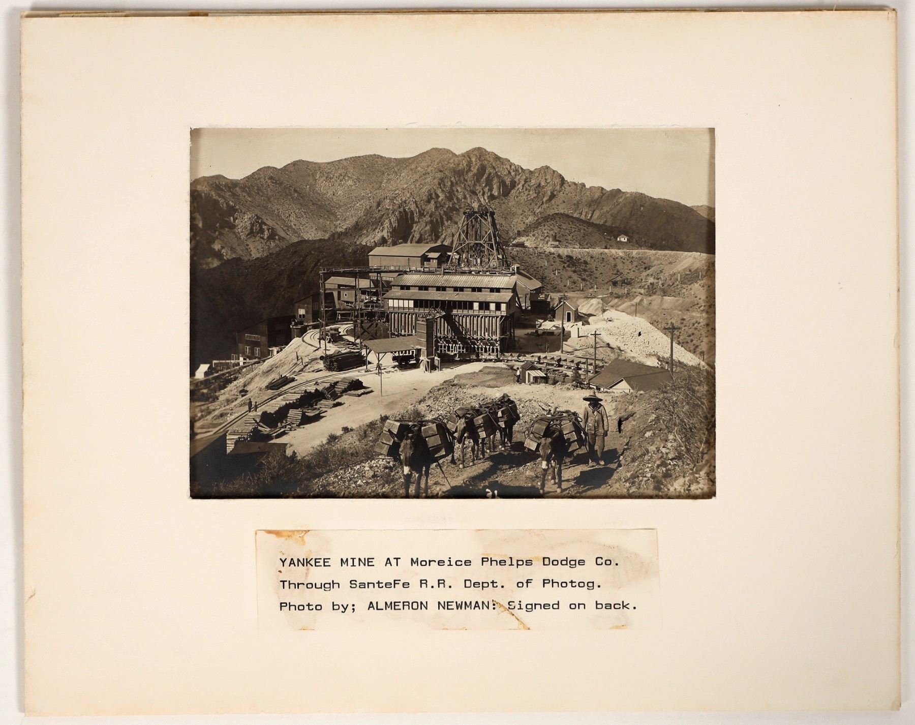 Excellent photograph by Almeron Newman showing loaded burros in the foreground and mine and mill in the mountains in the background. Back of photo is labelled as the Yankee Mine, Morenci, Phelps Dodge Co. and photo by Almeron Newman (signed). Almeron Newman (1875-1964) was a photographer who moved to the small town of Deming, New Mexico, in 1899 and worked as a photographer. In 1900, Newman was living in a boarding house in Tucson City. By 1909 he had settled in Trinidad, Colorado. 4.5 x 6.5"