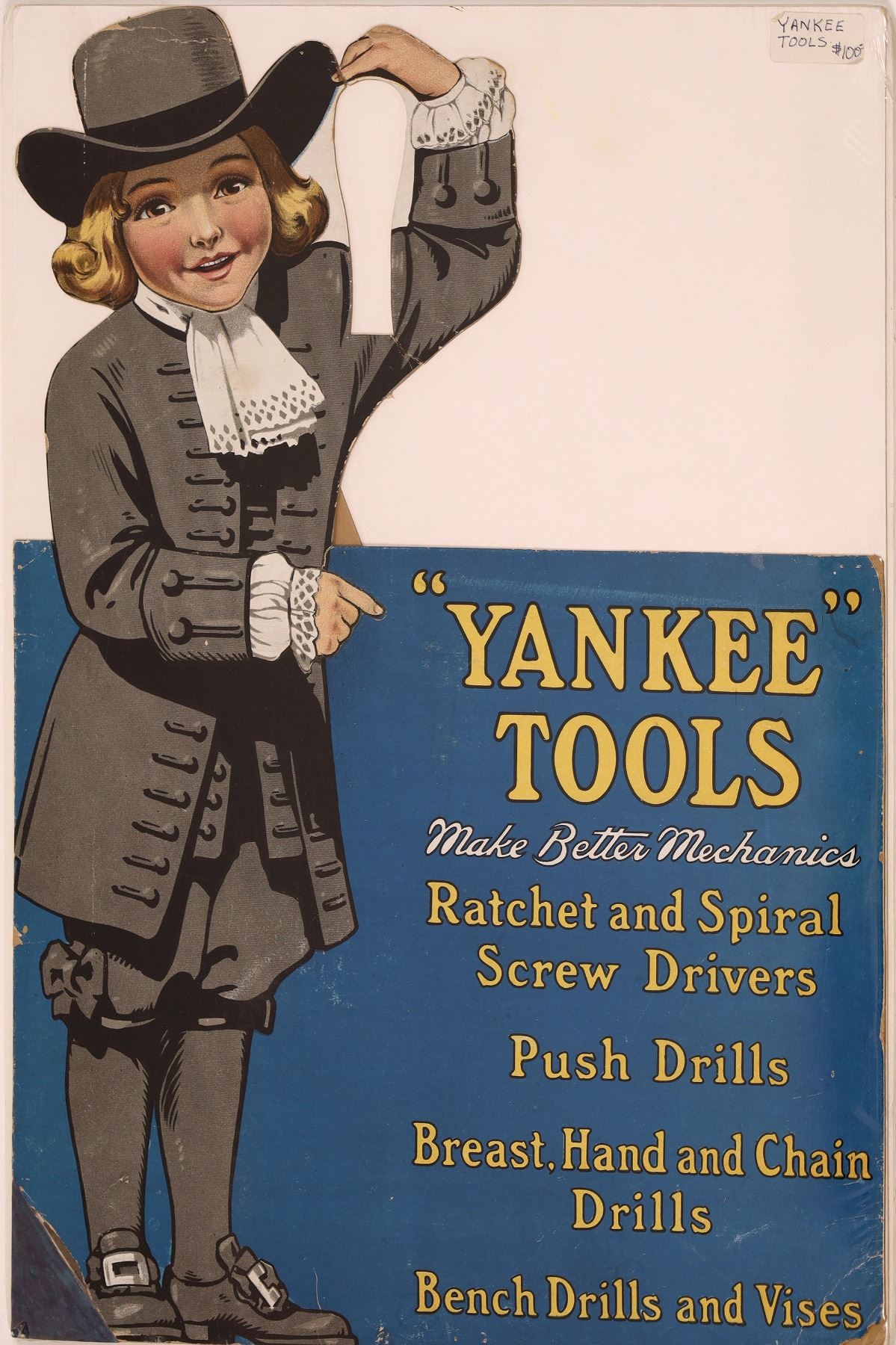This Yankee Tools sign shows specialty hand drills. A die-cut stand-up sign. "Make better mechanics". Some foxing and chips in the corners. 20 x 14 inches Please see photos for details.