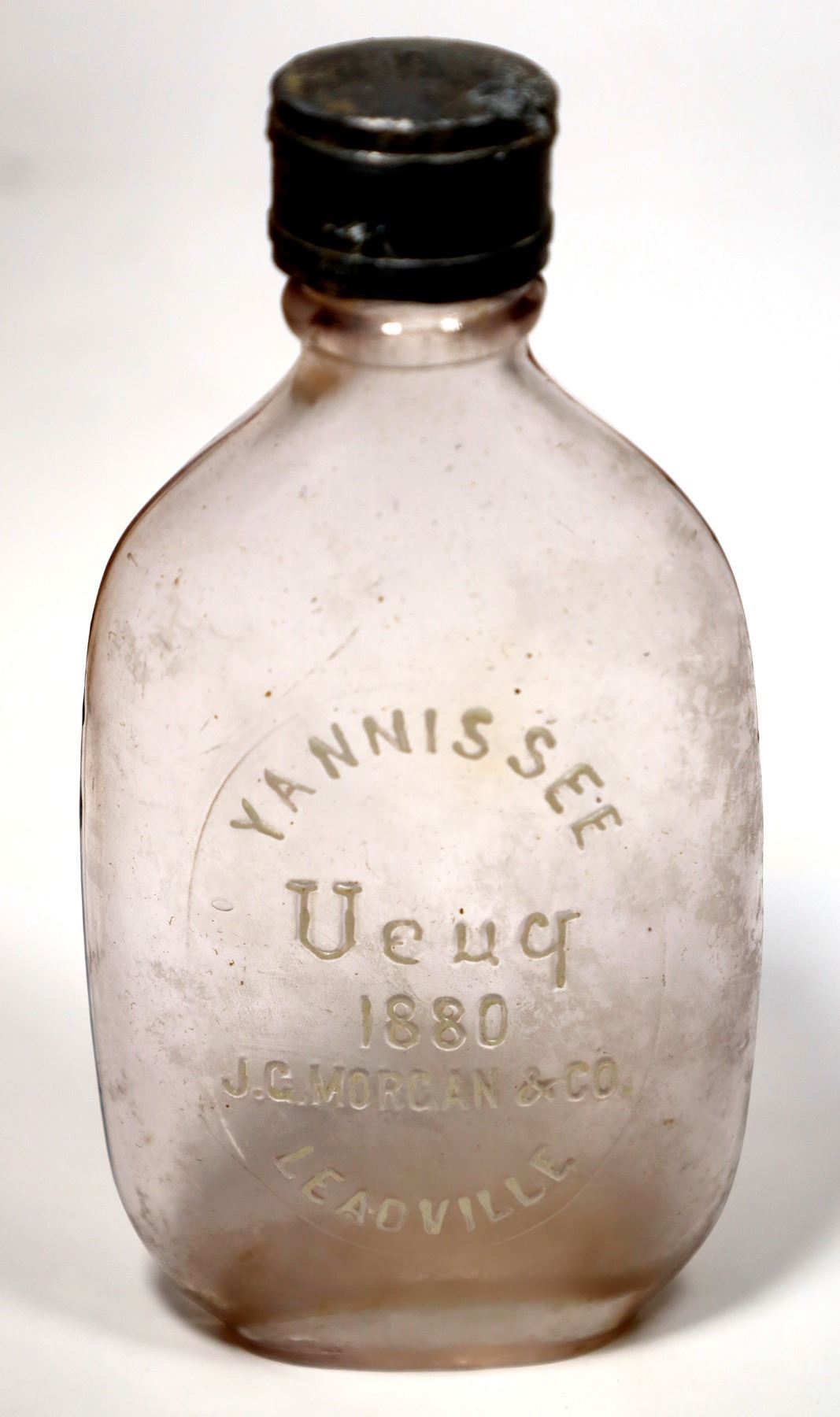 Preble W-120a. Very early flask! Yannissee / Ucuq / 1880 / J.G. Morgan & Co. / Leadville. Pocket flask, purple glass, 6 1/8", ground top with metal cap. White embossed letters. Haziness, discoloration on lip, original whiskey stains on bottom! Please inspect. J.G. Morgan & Co. operated the Board of Trade saloon located at 315 Harrison Avenue.