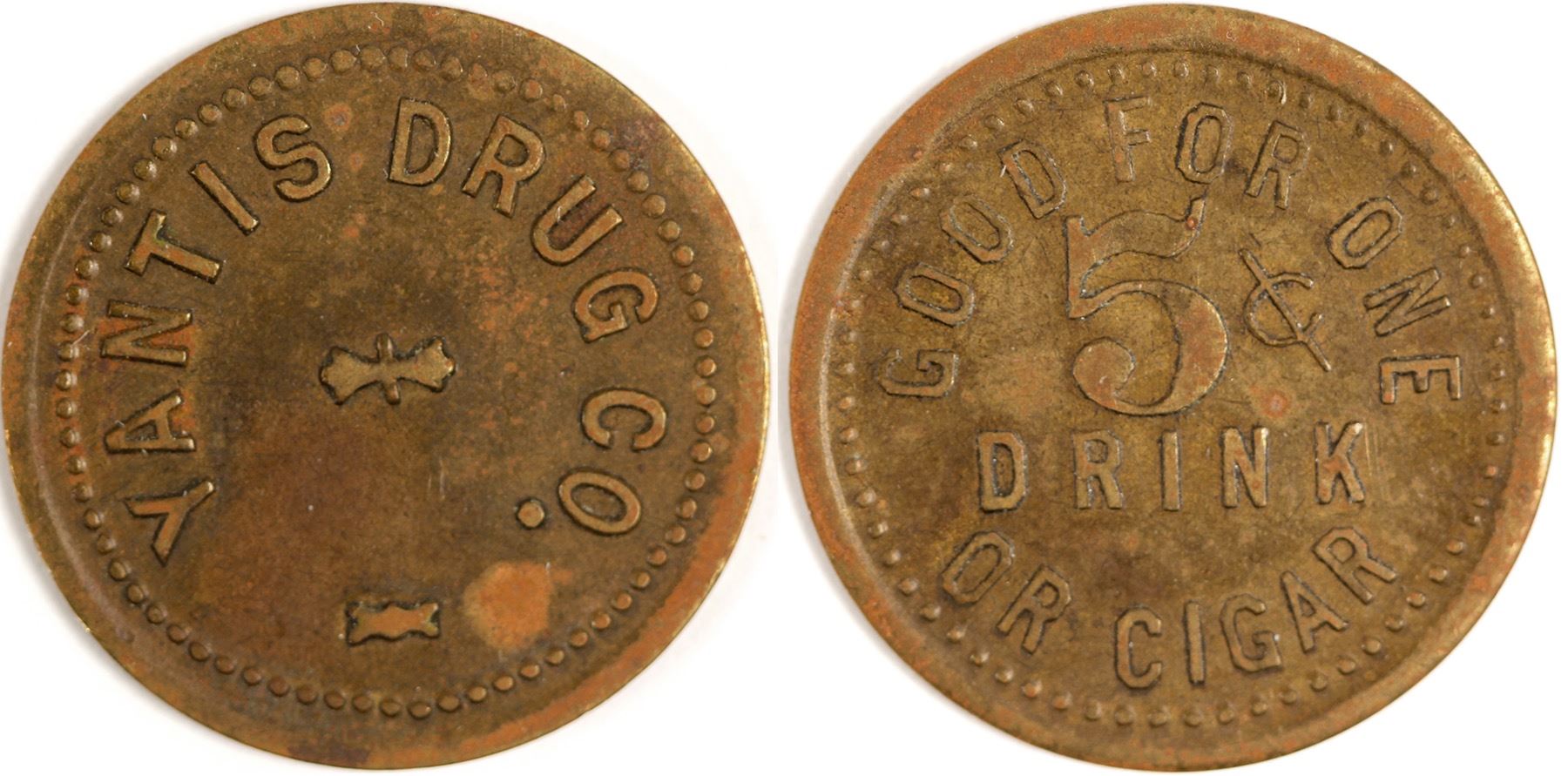 Round brass 25mm YANTIS DRUG CO. // GF ONE / 5C / DRINK OR CIGAR. Unlisted variety in Adams and Greever. Only known token for this town is aluminum. Strong die strike on obverse. HWAC# 62349 Date: Location: Yantis, Texas