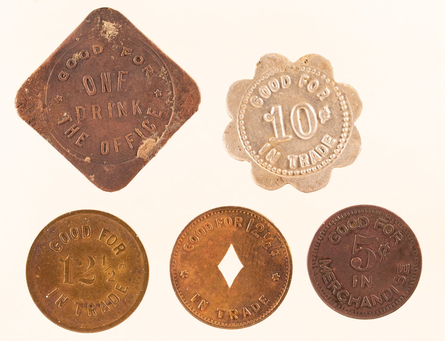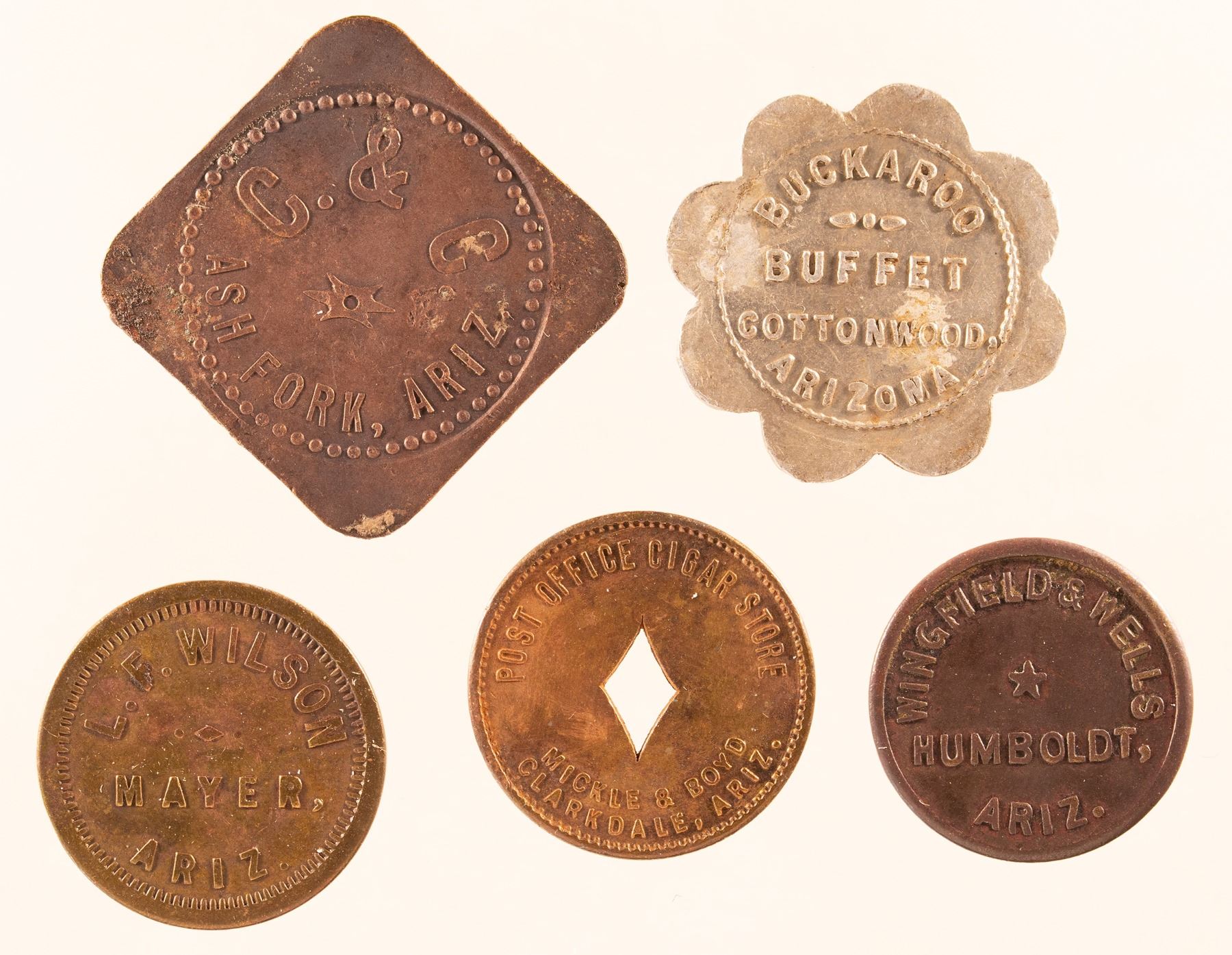 2) BUCKAROO / BUFFET / COTTONWOOD, / ARIZONA // GOOD FOR / 10¢ / IN TRADE; Al., Sc 8, 25 mm. 3) C. & C. / ASH FORK, ARIZ. // GOOD FOR / ONE / DRINK / THE OFFICE; Br., Sq., 25 mm. 4) WINGFIELD & WELLS / HUMBOLDT, / ARIZ. // GOOD FOR / 5¢ / IN / MERCHANDISE; Br., rd., 20 mm. 5) L.F. WILSON / MAYER, / ARIZ. // GOOD FOR / 12½¢ / IN TRADE; Br. rd., 21 mm.