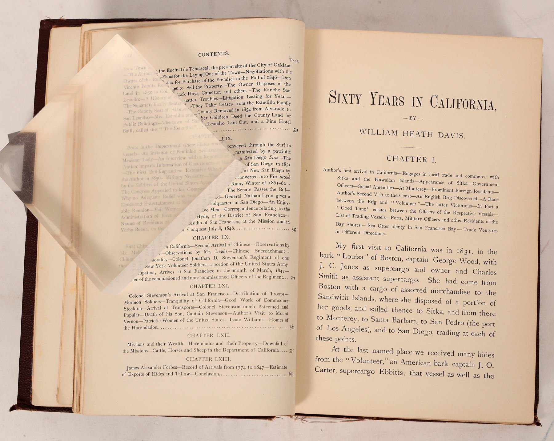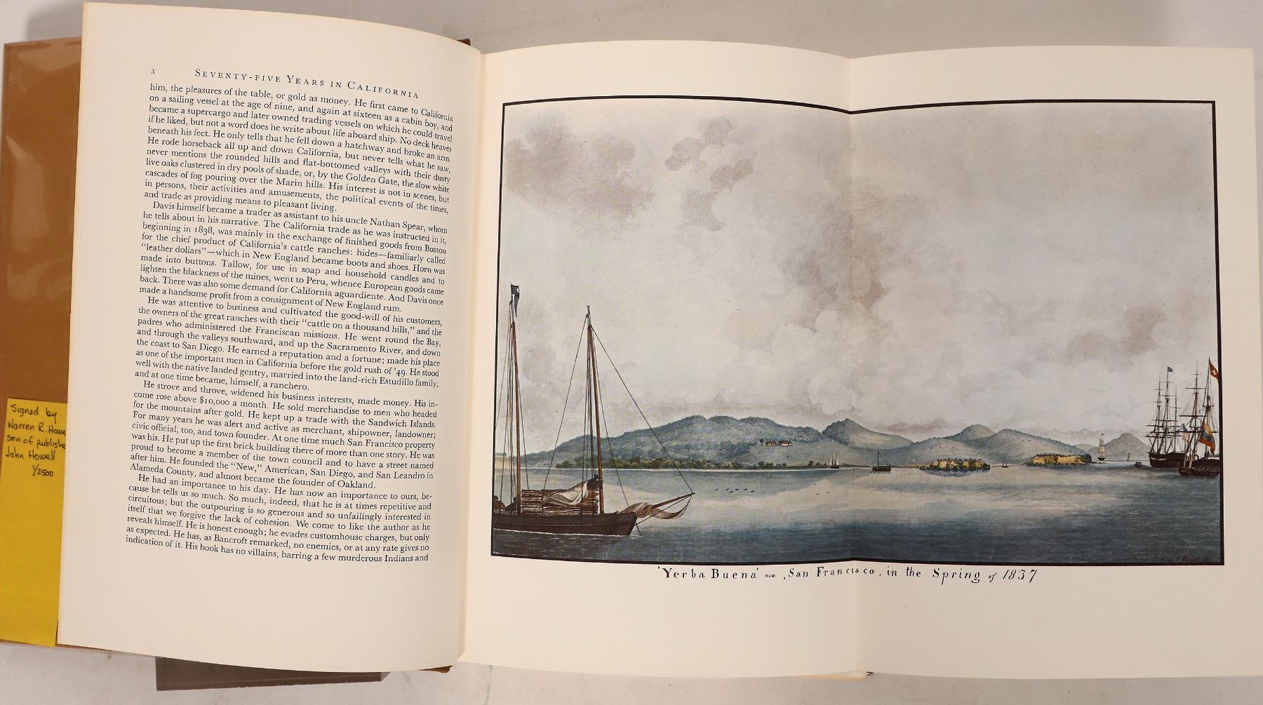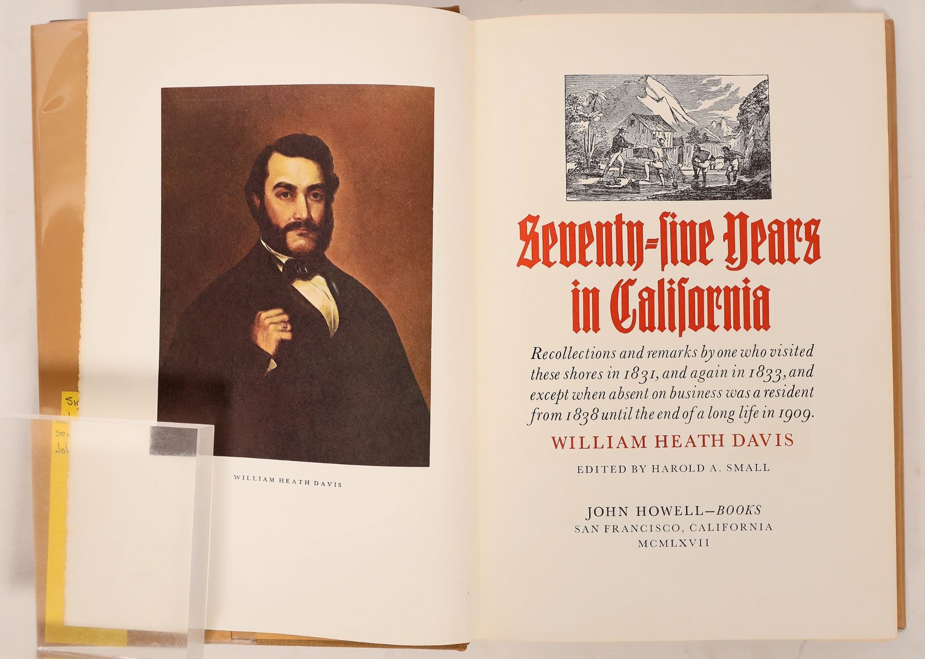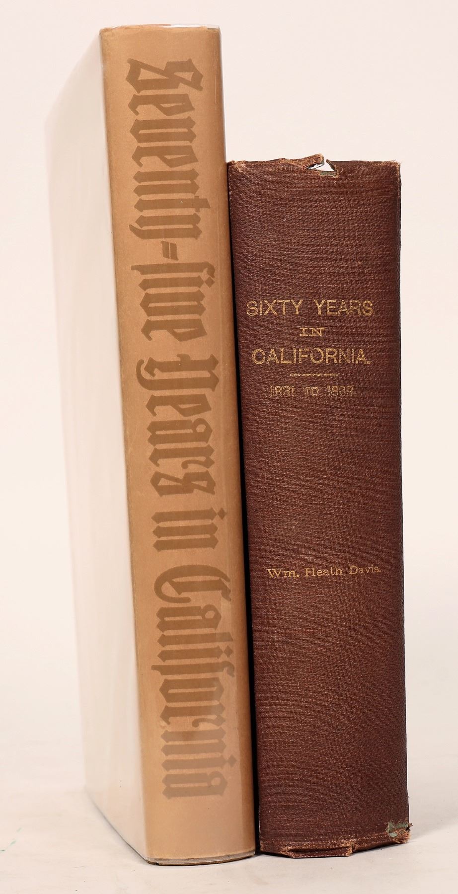 A pair of books by William Heath Davis, one published in 1889, the other 1967 and signed by the publisher's son. Includes: "Sixty Years in California - 1831-1889: A History of Events and Life in California; Personal, Political and Military, under the Mexican Regime; during the Quasi-military government of the territory by the United State, and After the Admission of the State into the Union, being a compilation by a witness of the events described," William Heath Davis, 1889, first edition, 639 pp., 8.75" x 6", minor upper/lower spine and corner damage, hinges repaired; and "Seventy-Five Years in California," William Heath Davis, 1967, third edition, with additions, signed by the publisher, John Howell's son, Warren R. Howell, Tokyo, Japan, 1973, "Recollections and remarks by one who visited these shores in 1831, and again in 1833, and except when absent on business was a resident from 1838 until the end of a long life in 1909," 345 pp., 10.5" x 7.5", dust jacket, fine.