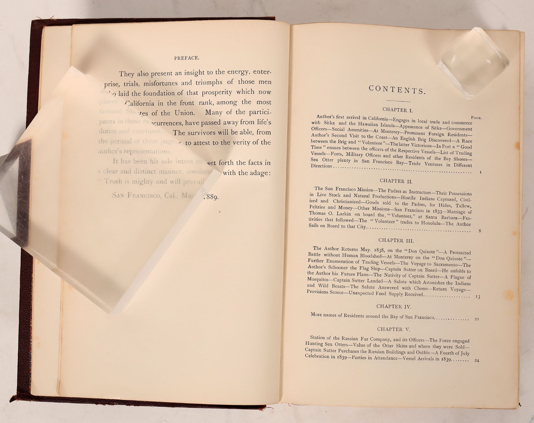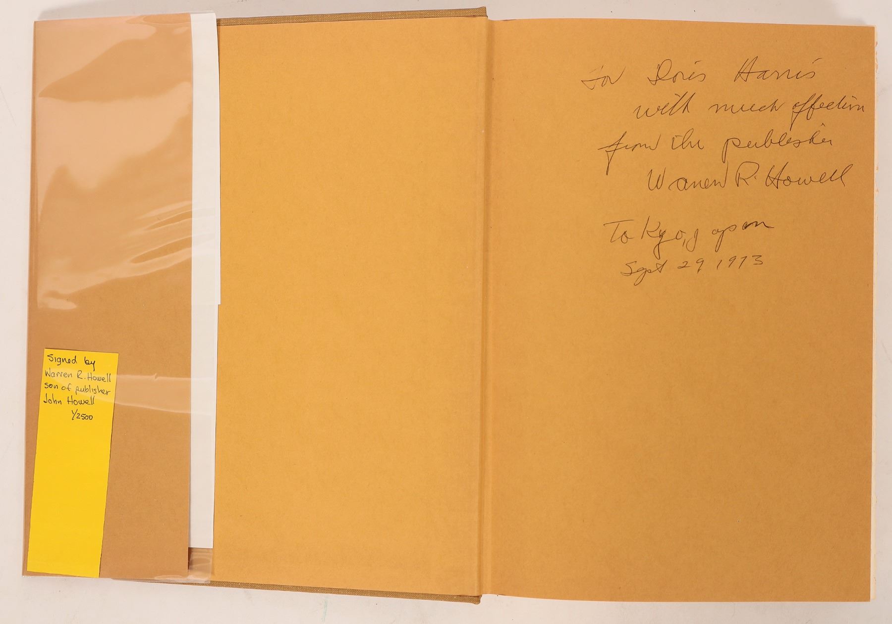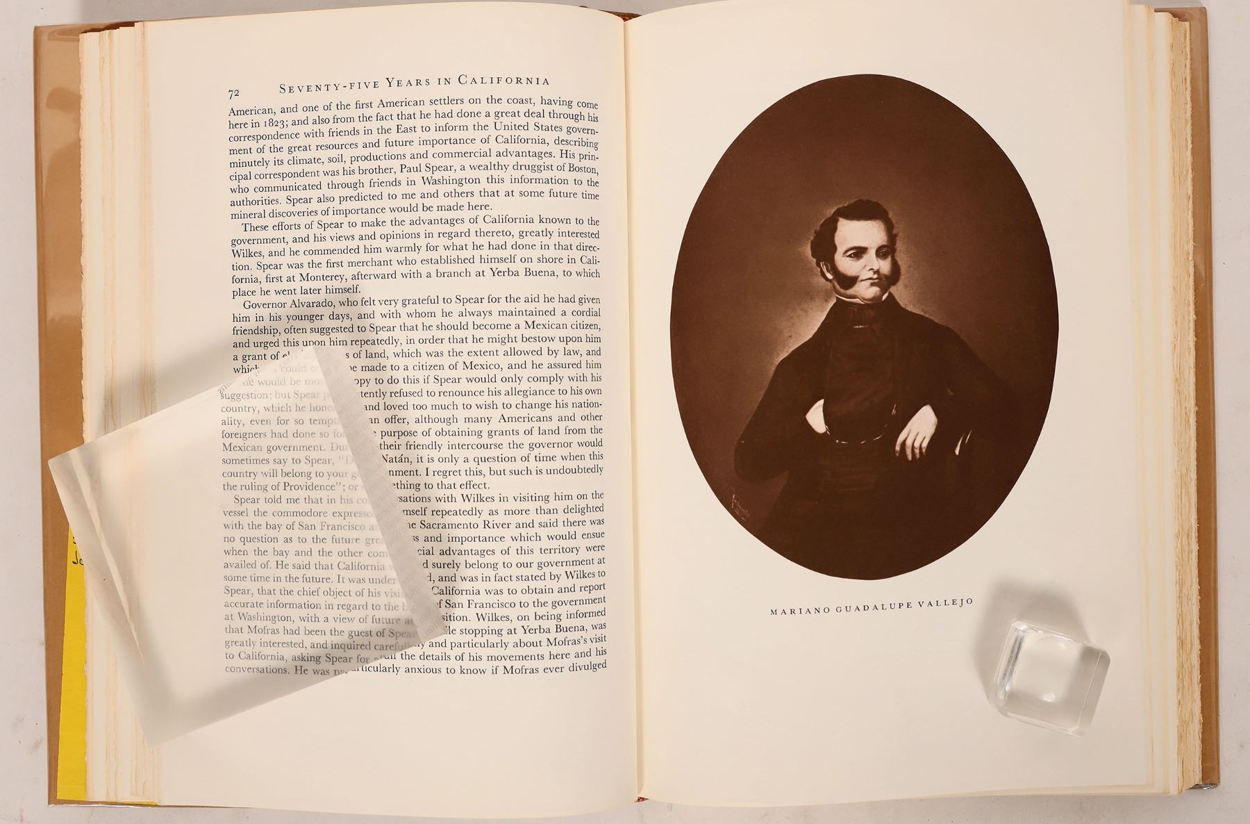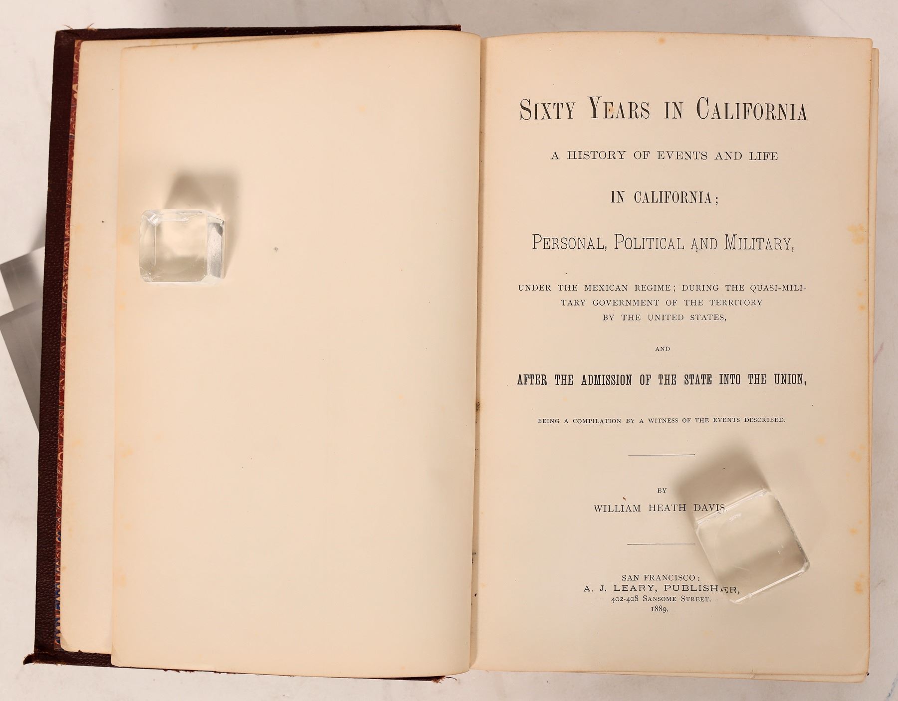 A pair of books by William Heath Davis, one published in 1889, the other 1967 and signed by the publisher's son. Includes: "Sixty Years in California - 1831-1889: A History of Events and Life in California; Personal, Political and Military, under the Mexican Regime; during the Quasi-military government of the territory by the United State, and After the Admission of the State into the Union, being a compilation by a witness of the events described," William Heath Davis, 1889, first edition, 639 pp., 8.75" x 6", minor upper/lower spine and corner damage, hinges repaired; and "Seventy-Five Years in California," William Heath Davis, 1967, third edition, with additions, signed by the publisher, John Howell's son, Warren R. Howell, Tokyo, Japan, 1973, "Recollections and remarks by one who visited these shores in 1831, and again in 1833, and except when absent on business was a resident from 1838 until the end of a long life in 1909," 345 pp., 10.5" x 7.5", dust jacket, fine.