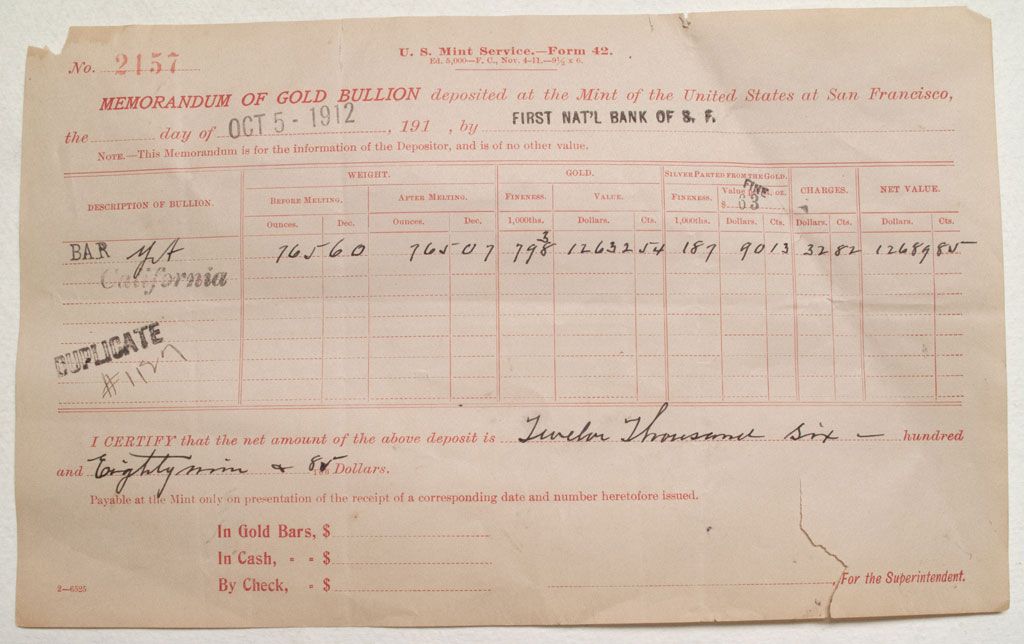 U. S. Mint Service receipt for Gold Bullion from the Yellow Mine for $12,689.85 dated Oct. 5 1912. Date 1912 San Francisco, CA hwac 8455