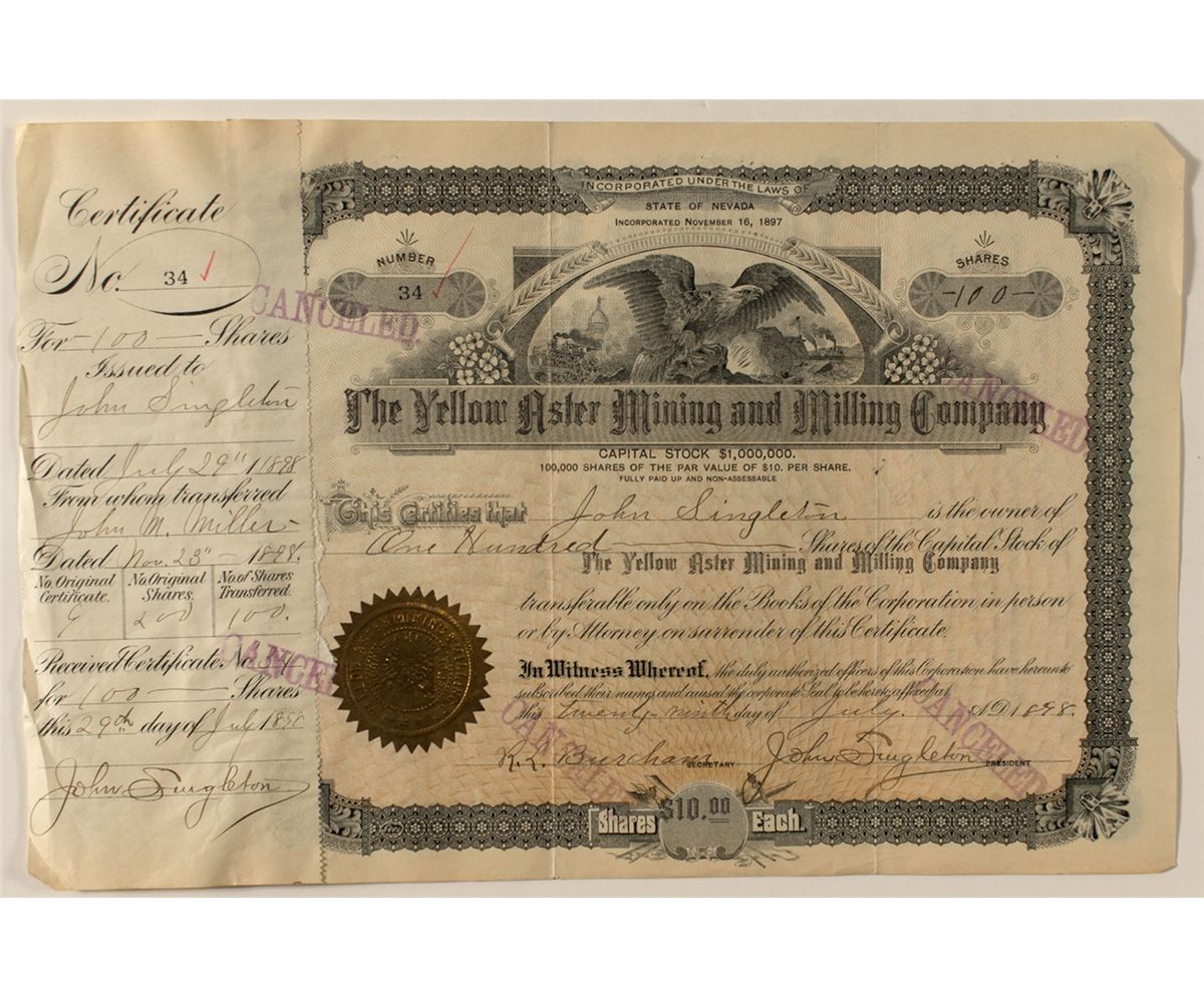 VERY EARLY # 34 for 100 shares to John Singleton. Signed by president John Singleton (an expert carpenter and millwright) and Roselle Burcham. Singleton was one of the three founders of the mine which is often referred to as the ïGlory Hole.î Date 1898 Randsburg, CA hwac 20436