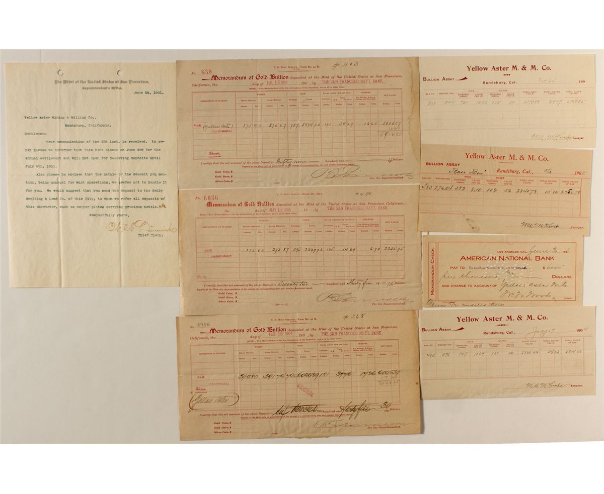 Great grouping. Three 1904/5 Bullion Assays. Three 1905 Memorandums of Gold Bullion from the United States Mint in San Francisco. Each Bullion Assay is matches one of the US Mint Memorandums. 1906 check. 1901 Letter from the United States Mint n San Francisco informing the mine that they will be closed from June 22 to July 5 for the annual settlements. The letter also states that the unusual shipment would be better sent to SelbyÍs than the Mint. Date 1901-1905 Randsburg, CA hwac 20462