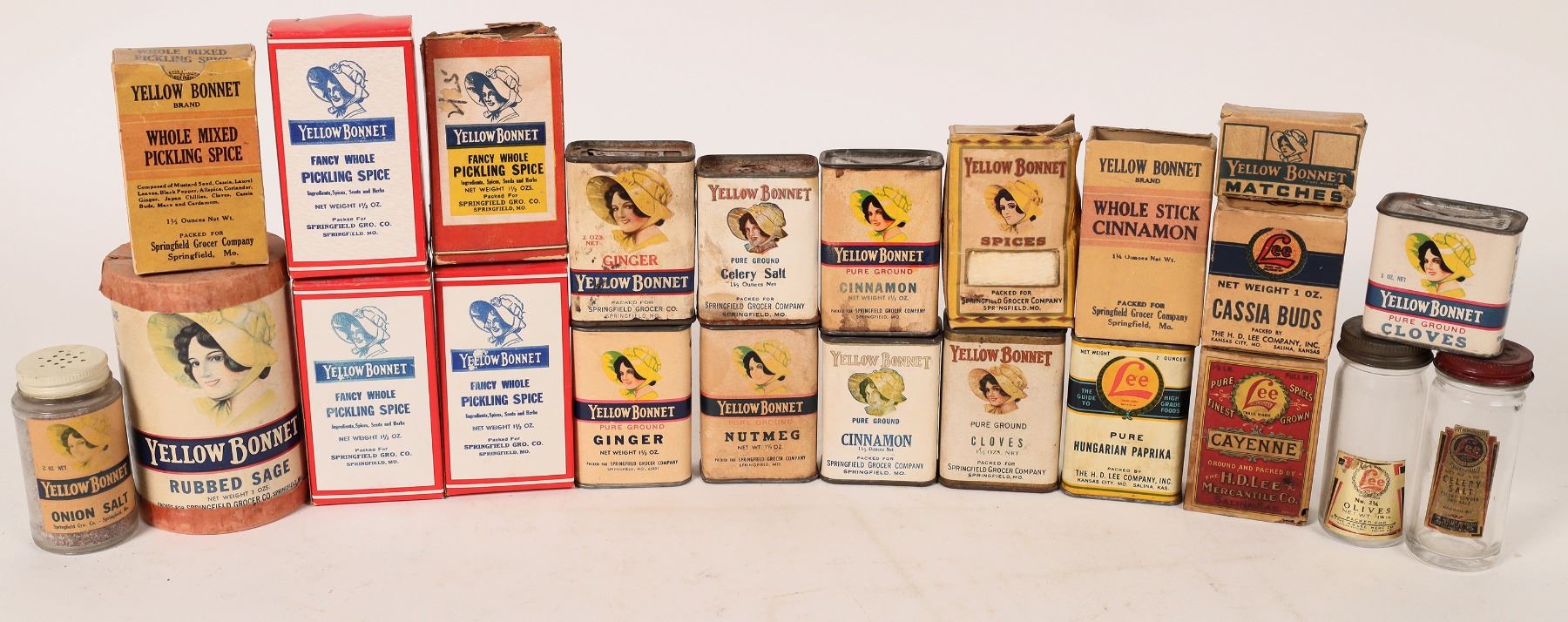 Several (Approx. 16) spice and food containers from Yellow Bonnet and Lee Foods, including pickling spice, sage and many more. Please see photos for more details. Missouri Springfield 1900s