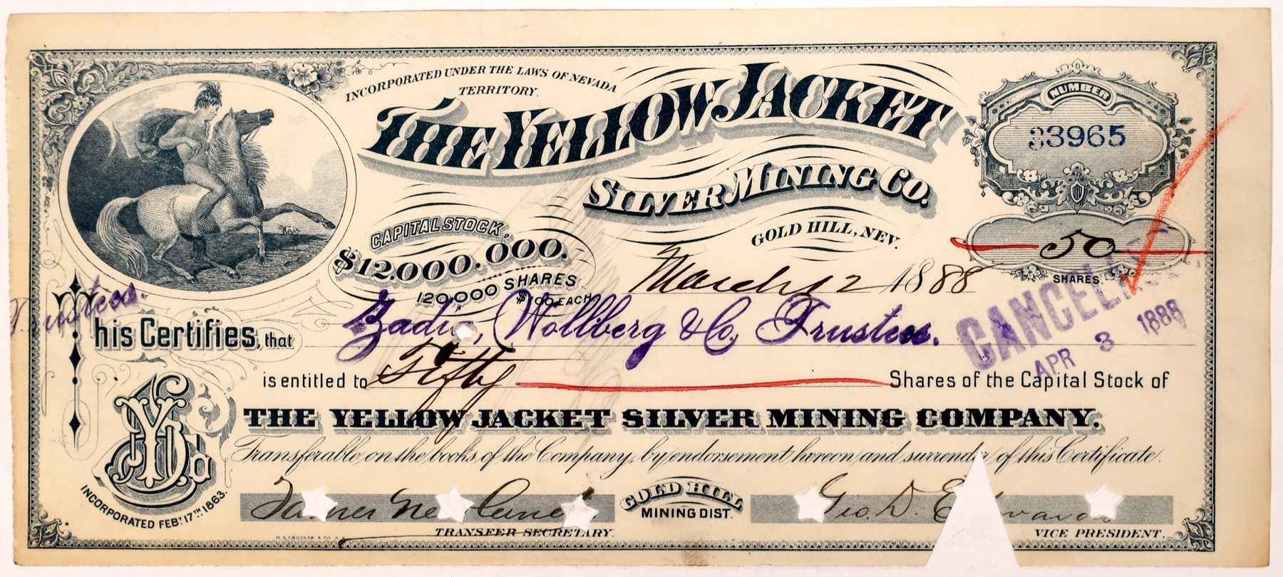 Inc. under the laws of Nevada Territory. Gold Hill Mining Dist. (printed bottom center). No. 33965, issued for 50 shares to Zadig, Wollberg & Co. in 1888 in Gold Hill. Signed by vice president Geo. Edwards and the transfer secretary. Cut, punch and stamp cancelled. Allegorical vignette of man on horse. Pinholes. 4 x 9" Famous Comstock mine that was the site of a horrific mine fire on April 7th, 1869 that left at least 35 miners dead.