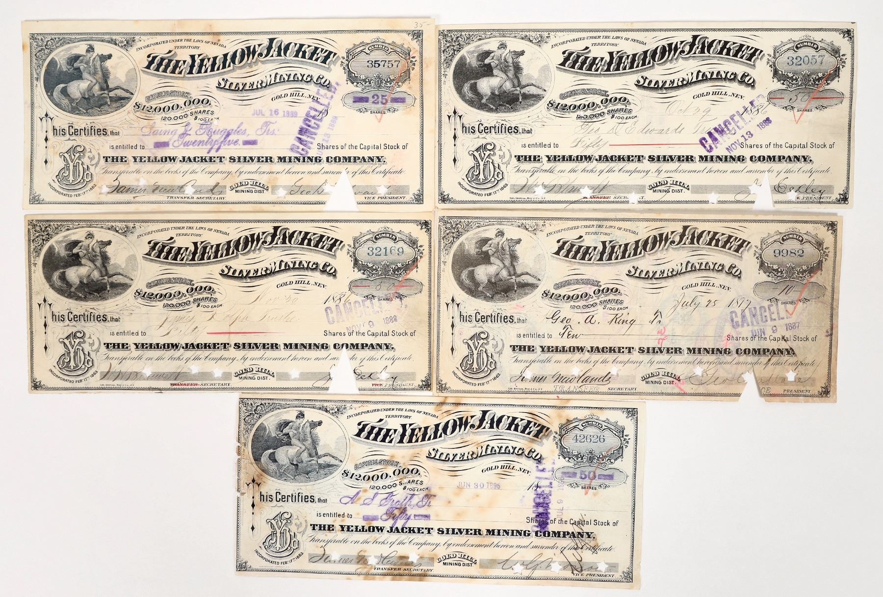 5x issued 1879-96. The Gold Hill mine was made famous by the underground fire that started on April 7, 1869 on the 800 foot level. Since the shifts were changing the casualties were smaller, but at least 35 men still perished. The fire also became a political football in the 1872 Senate race between William Sharon and John P. Jones, who had been superintendent of the mine at the time of the fire. Sharon accused Jones of starting the fire for stock manipulation. Sharon's accusation cost him the race. According to EMJ Vol 64, in 1897 the Yellow Jacket had just repaired the engine in the main shaft, and all previous officers had been re-elected for the 1897 year. Some staining, please inspect.