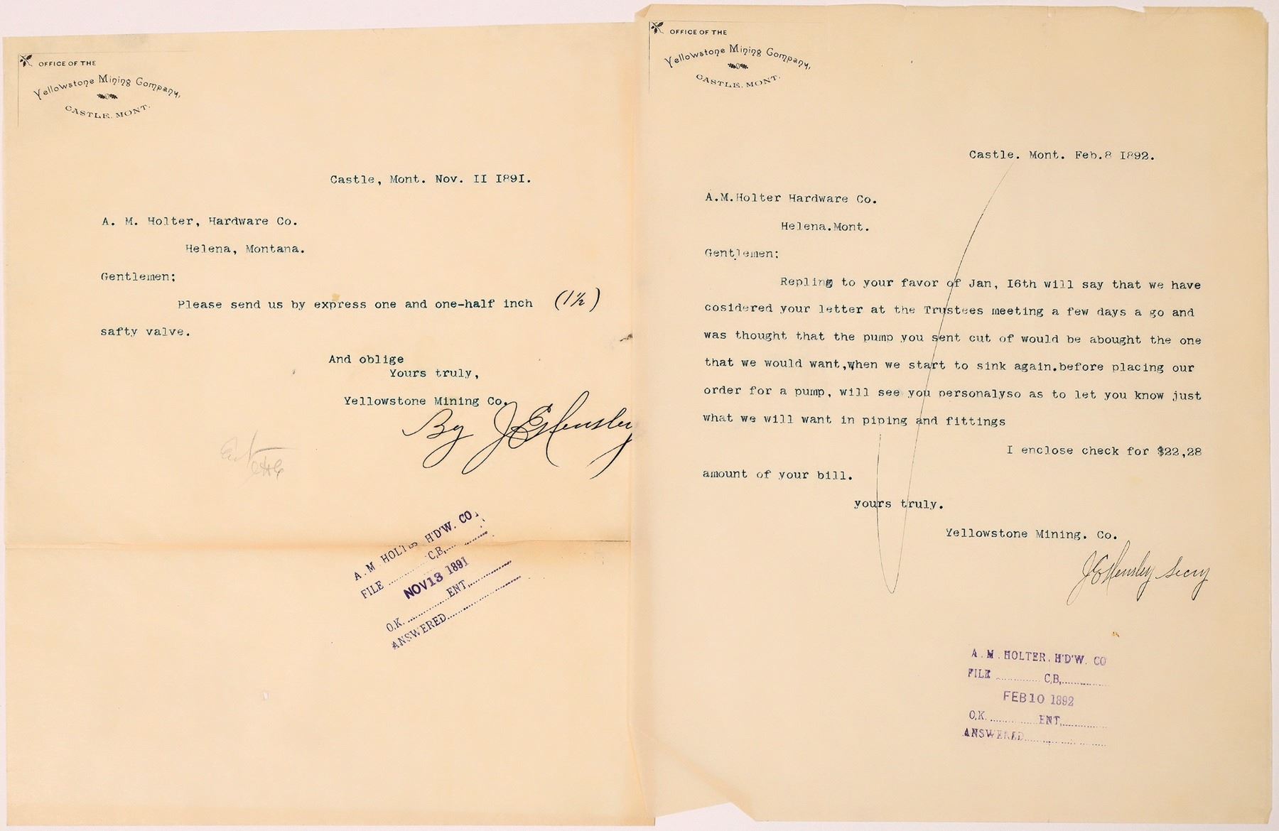 1892 letter from Castle Mining to AM Holter Hardware regarding a pump, creased. 1891 letter to AM Holter Hardware regarding a safety(sic) valve. This was a lead, zinc, and silver mine located in Meagher county, Montana at an elevation of 6,801 feet. Montana Castle